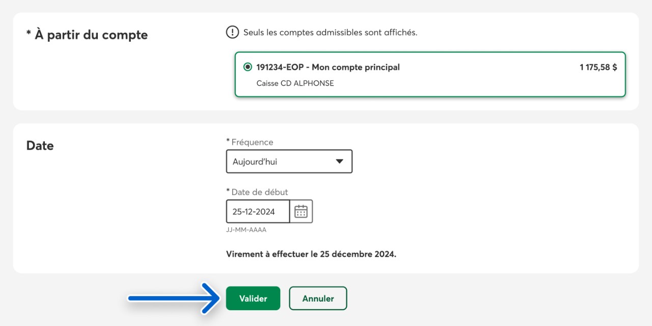 Une fois toutes les données entrées dans la page Faire un virement, sélectionnez le bouton Valider.