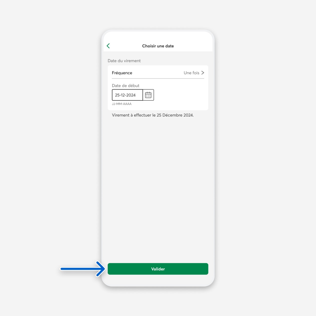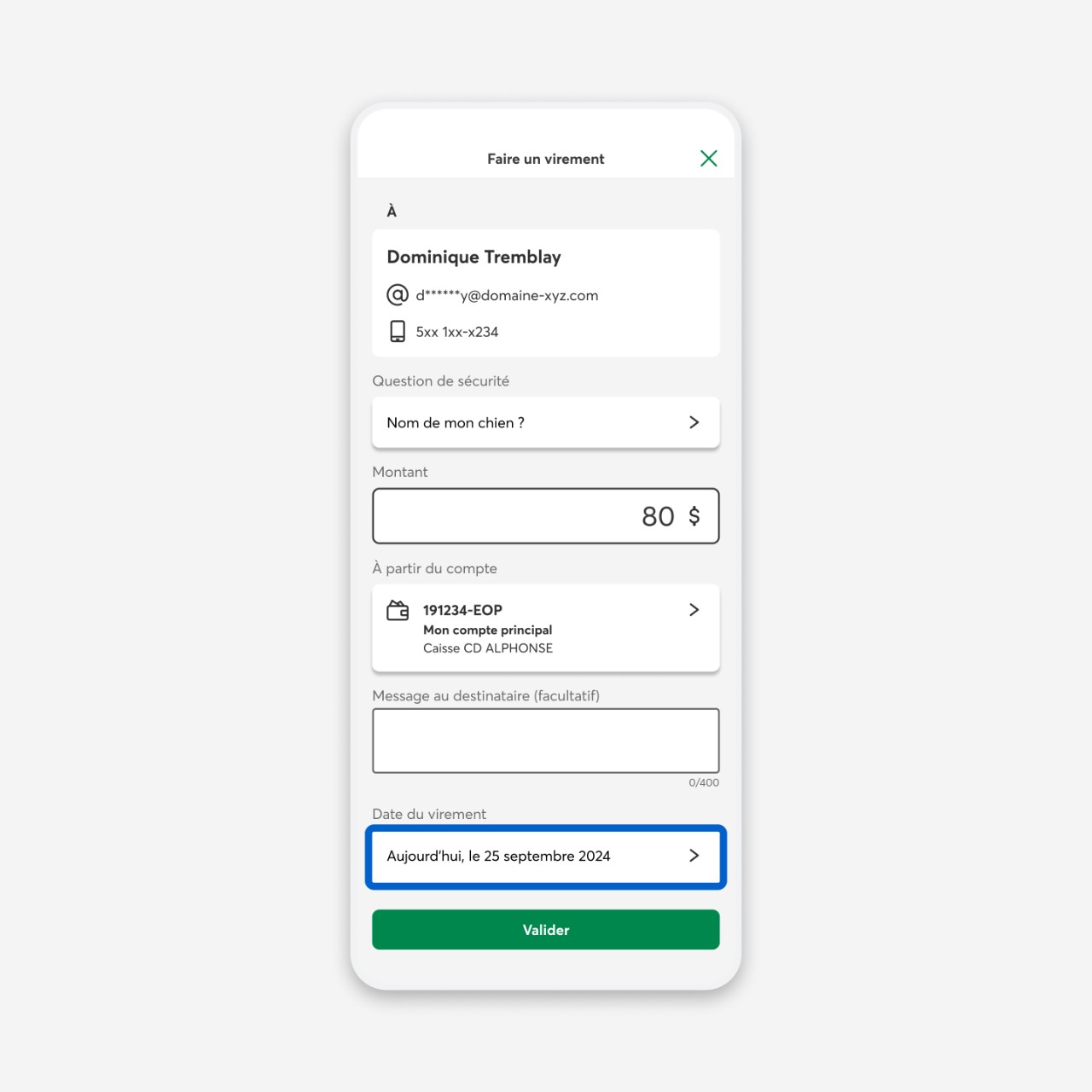 Dans la page Faire un virement, la date du virement est celle du jour par défaut. Sélectionnez le bouton de la date du virement pour la modifier.