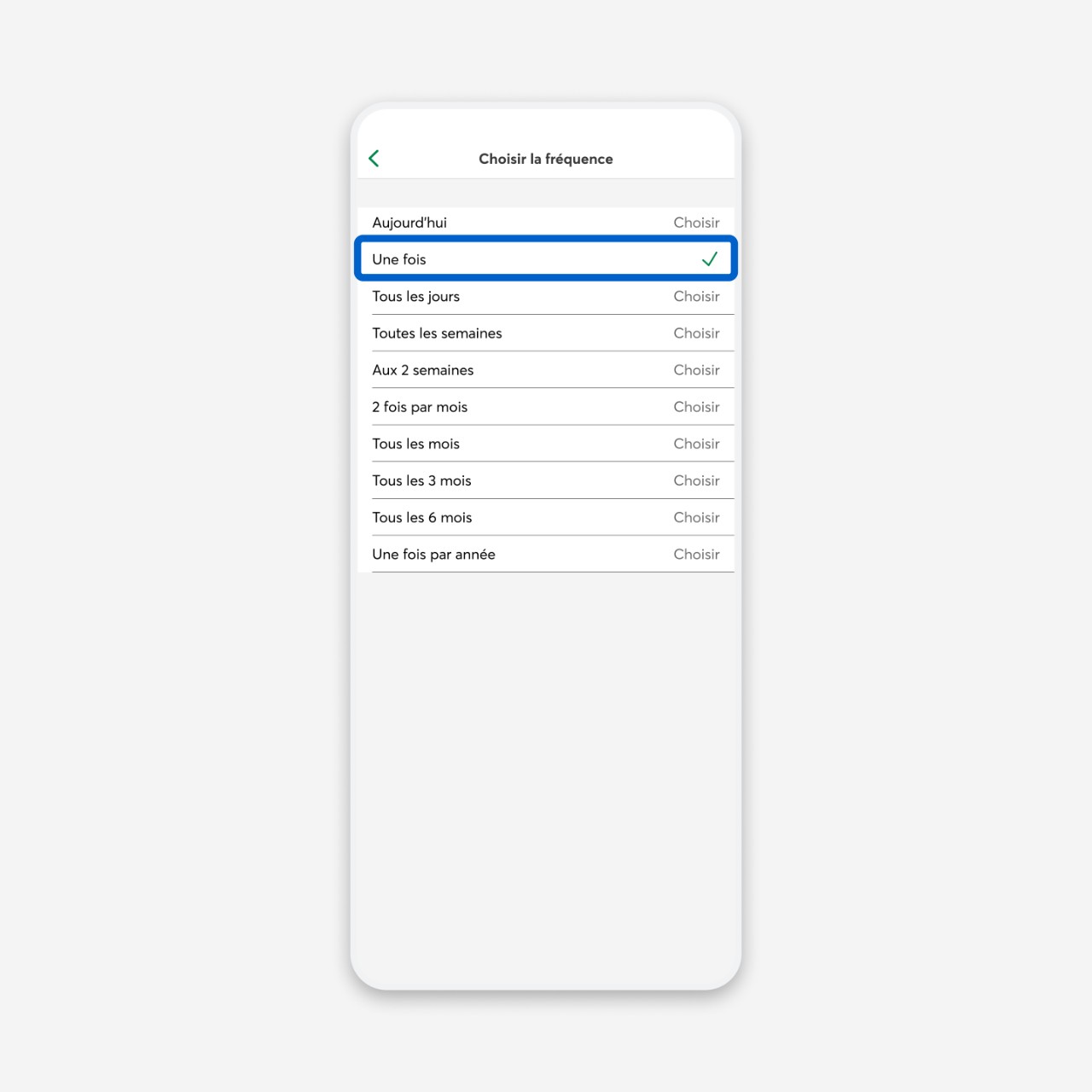 Choisissez la fréquence souhaitée dans la liste. Vous pouvez programmer votre Virement Interac à la date et à la fréquence de votre choix.