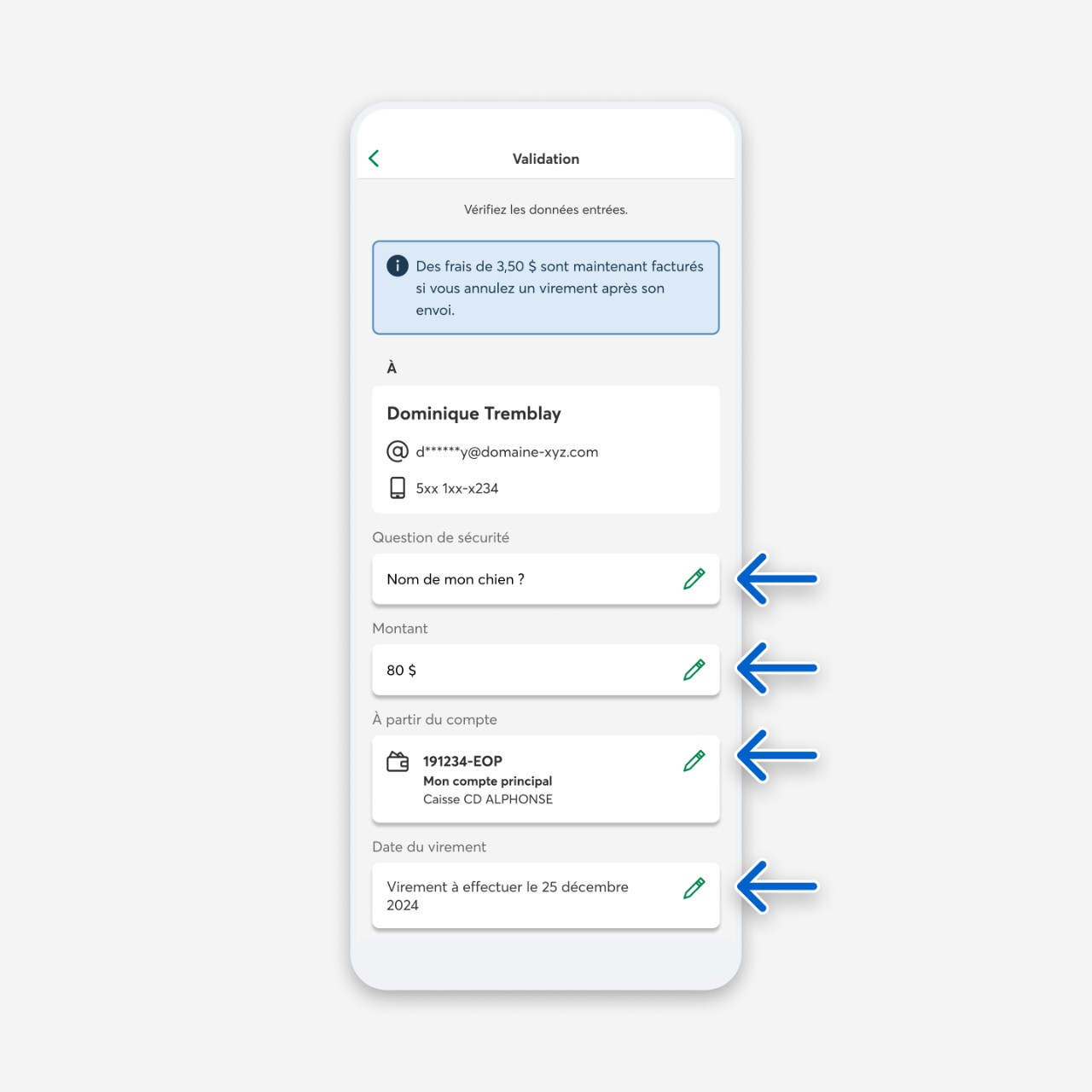Vérifiez les informations de la transaction. Vous pouvez modifier chaque information en sélectionnant le bouton associé (icône de crayon).