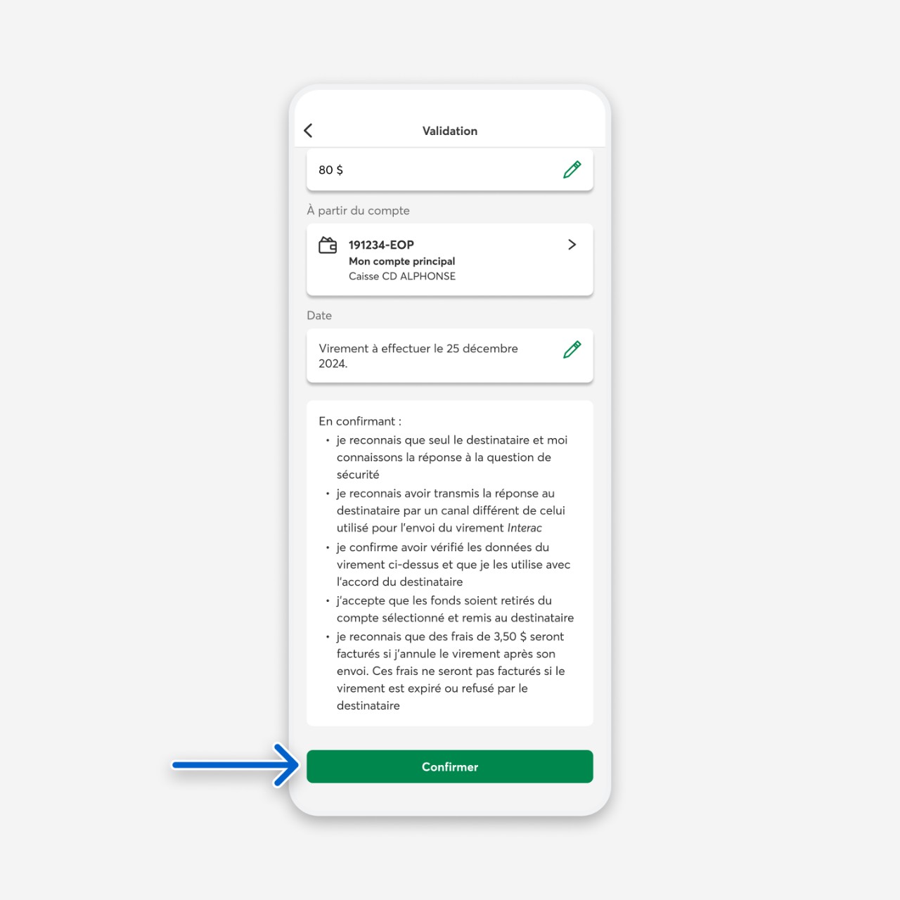 Sélectionnez le bouton Confirmer pour faire votre Virement Interac.
