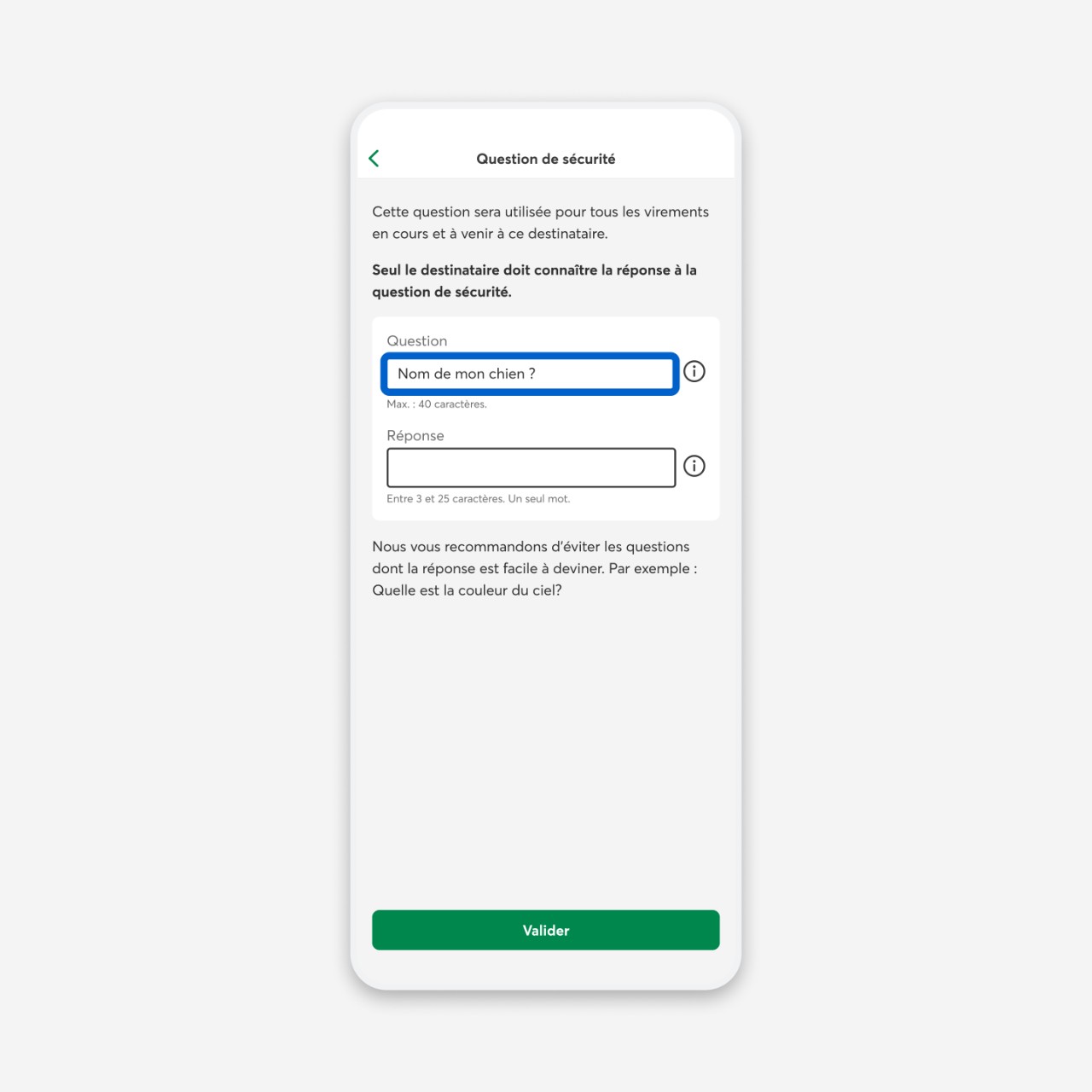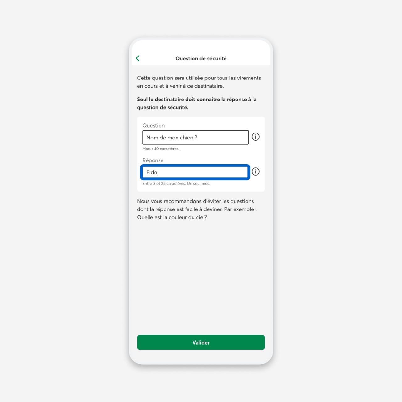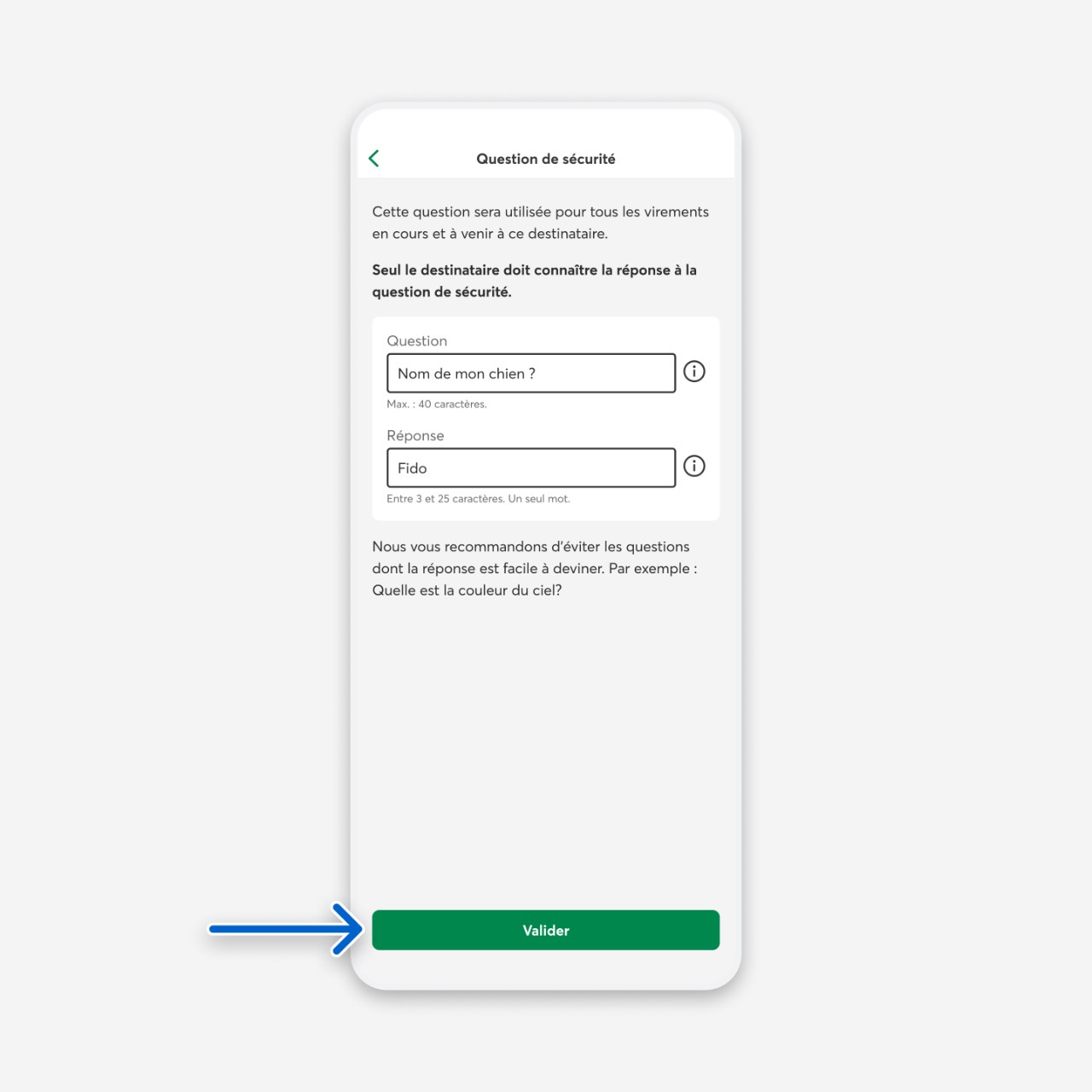 Dans la page Faire un virement, sélectionnez le bouton Ajouter une question de sécurité.