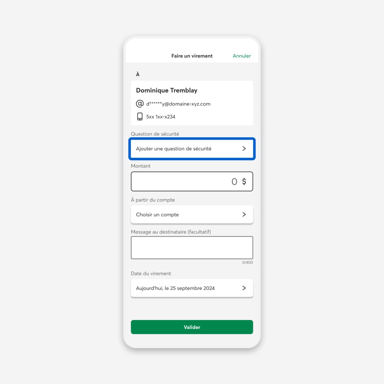 Entrez votre question de sécurité dans le champ Question. Votre destinataire devra répondre à cette question pour accepter le Virement Interac.