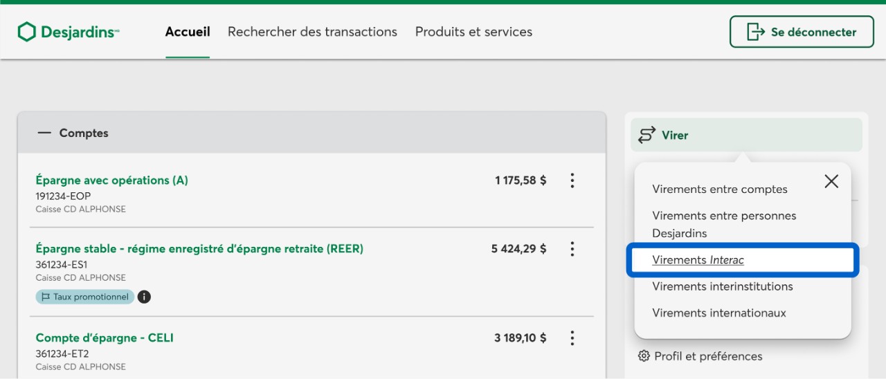 Dans la page Transactions, sélectionnez le bouton Virements Interac.
