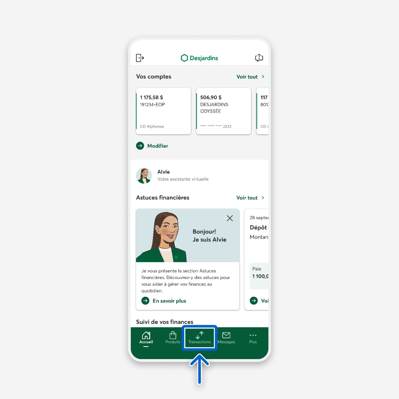 Connectez-vous à l’application Services mobiles Desjardins, puis sélectionnez l’onglet Transactions.