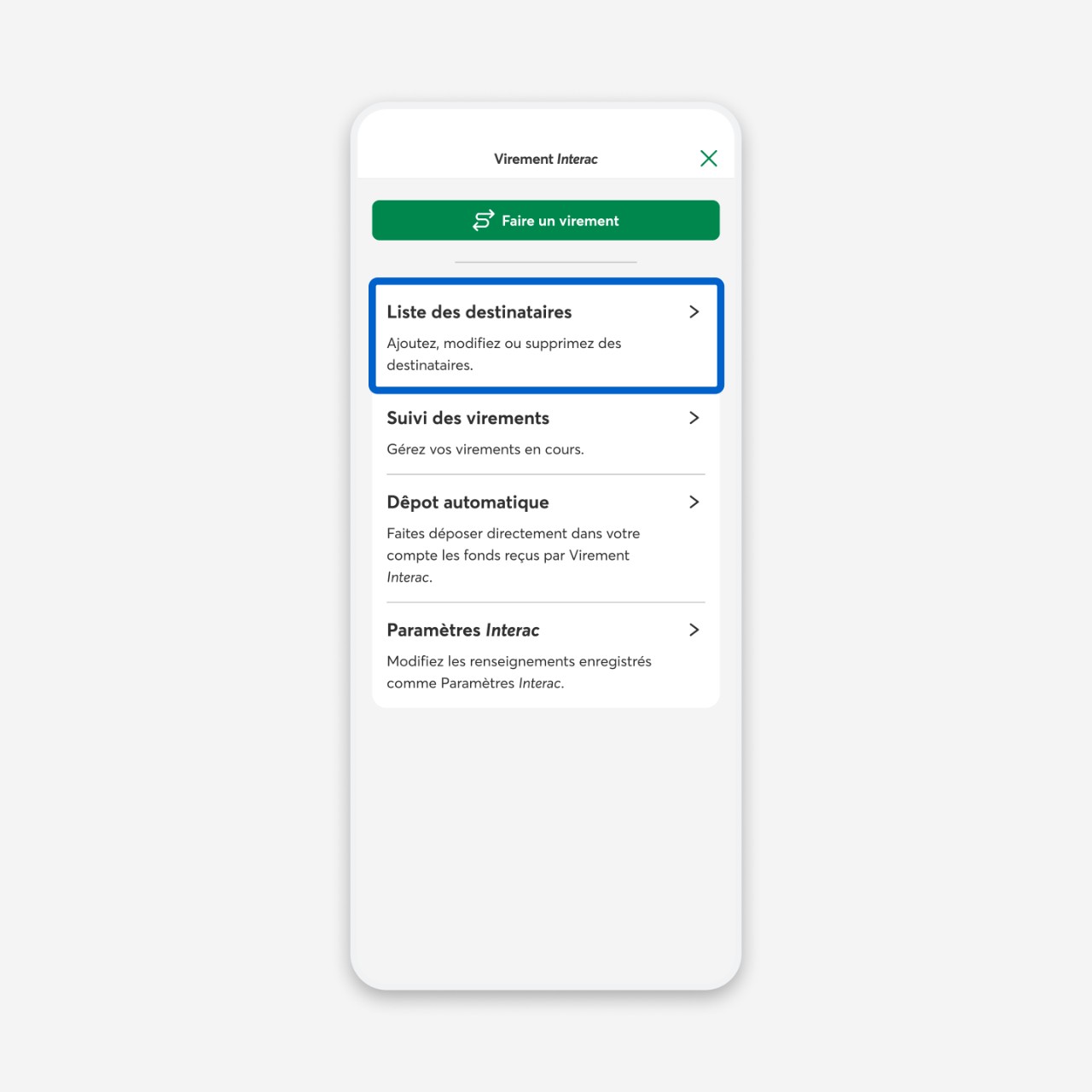 Dans la page Virement Interac, sélectionnez Liste des destinataires.