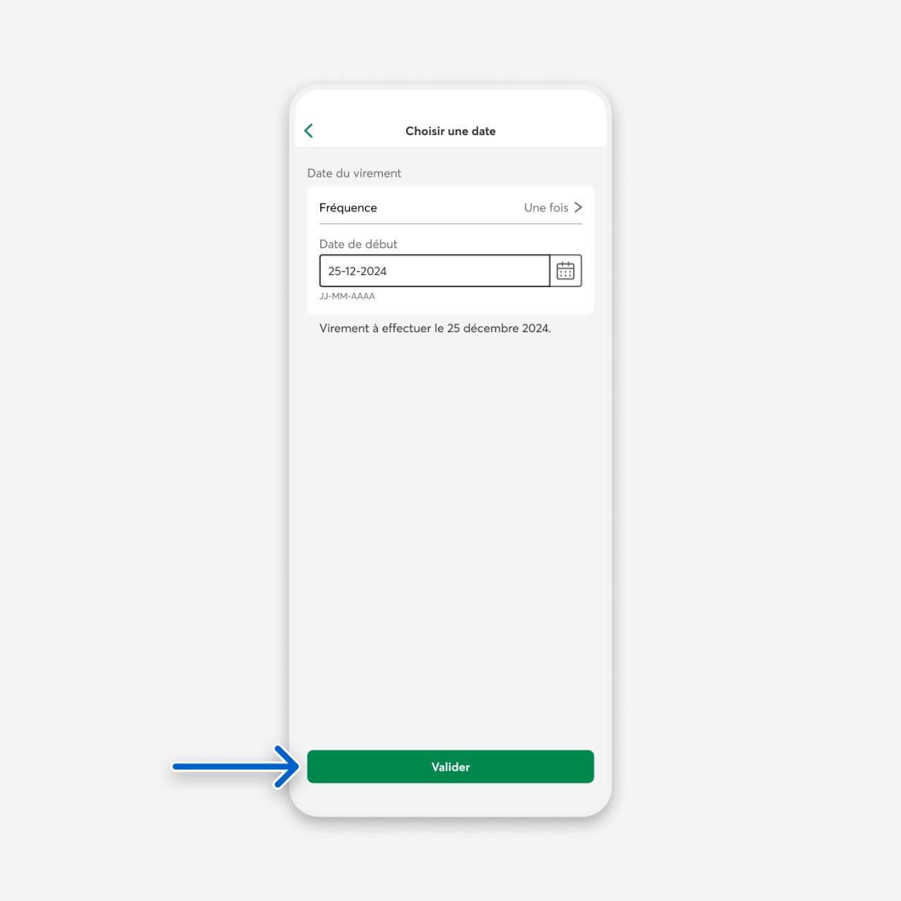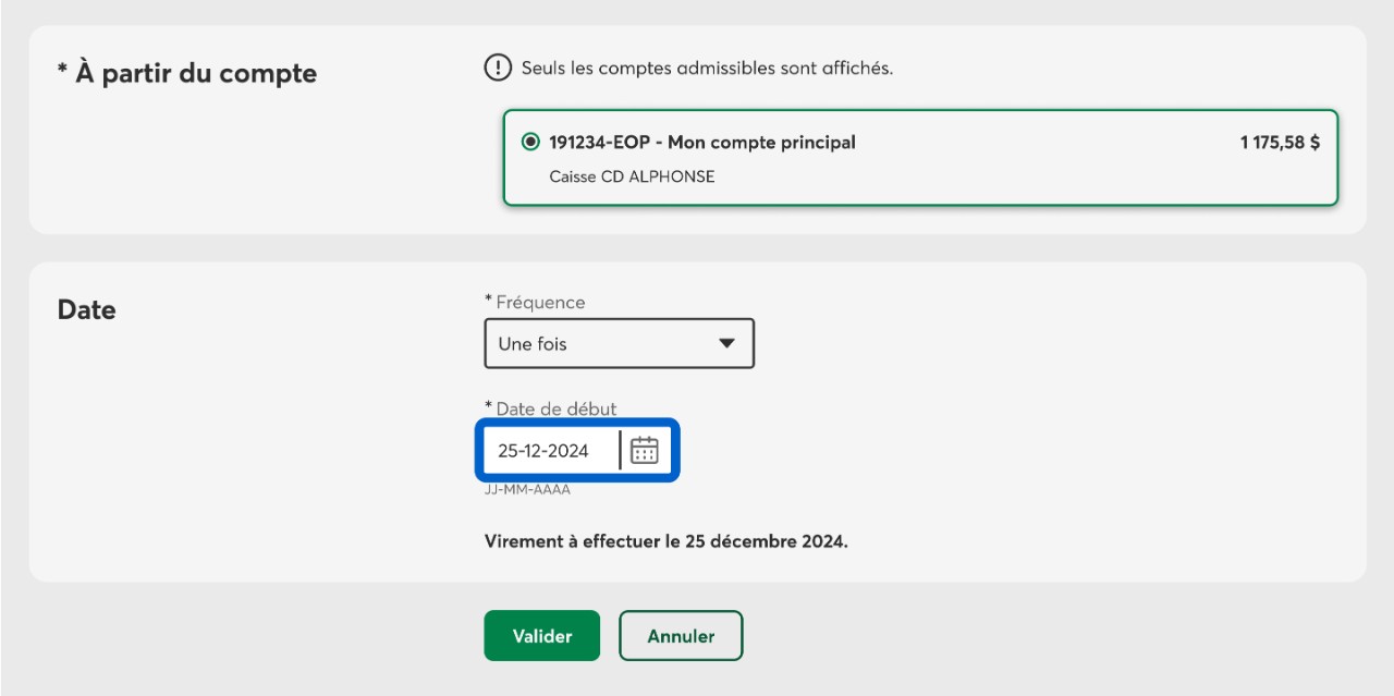 Dans le champ Date de début, entrez la date du virement au format JJ-MM-AAAA (exemple : 26-02-2024). Vous pouvez aussi sélectionner le bouton pour choisir une date dans le calendrier.