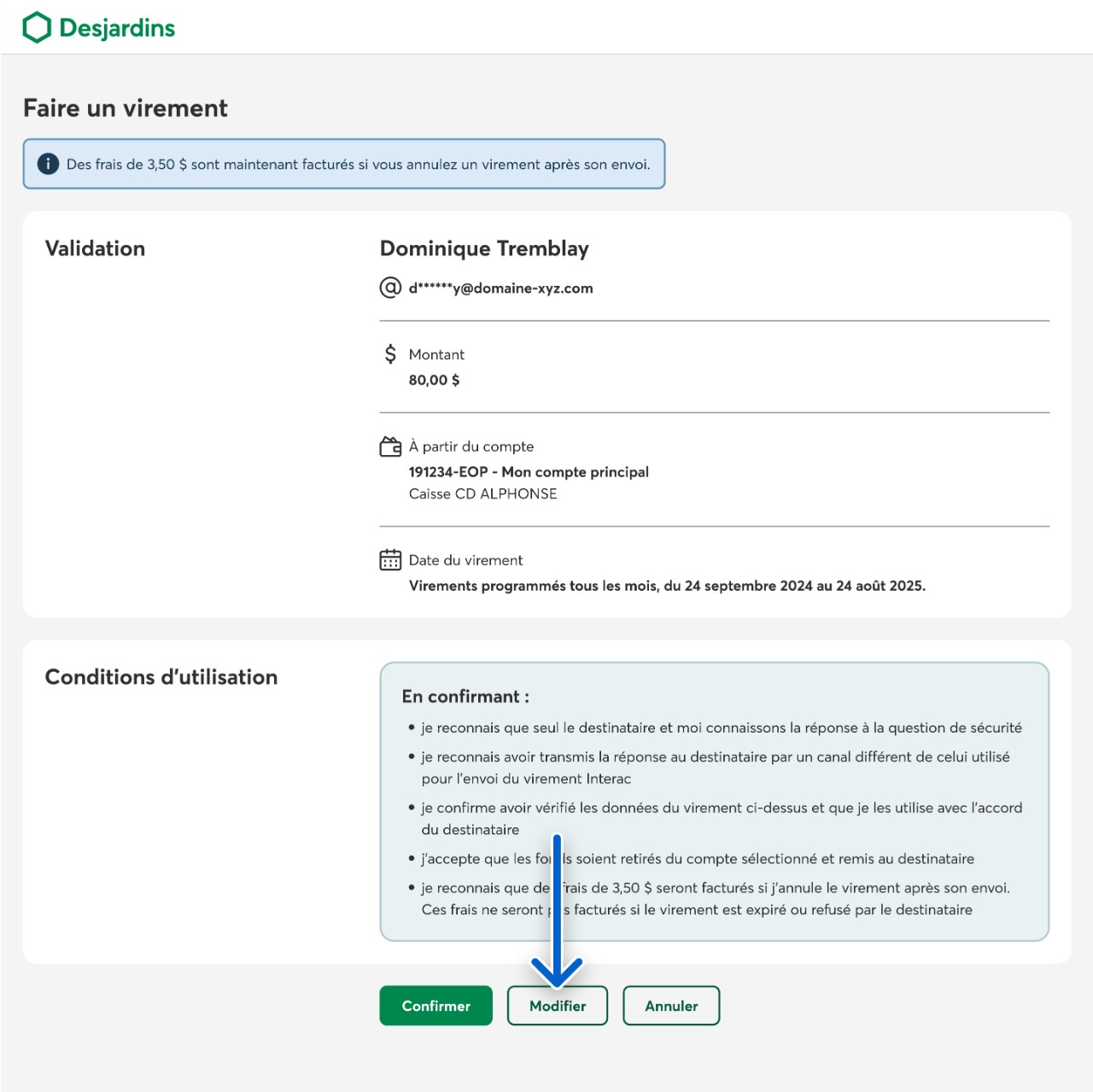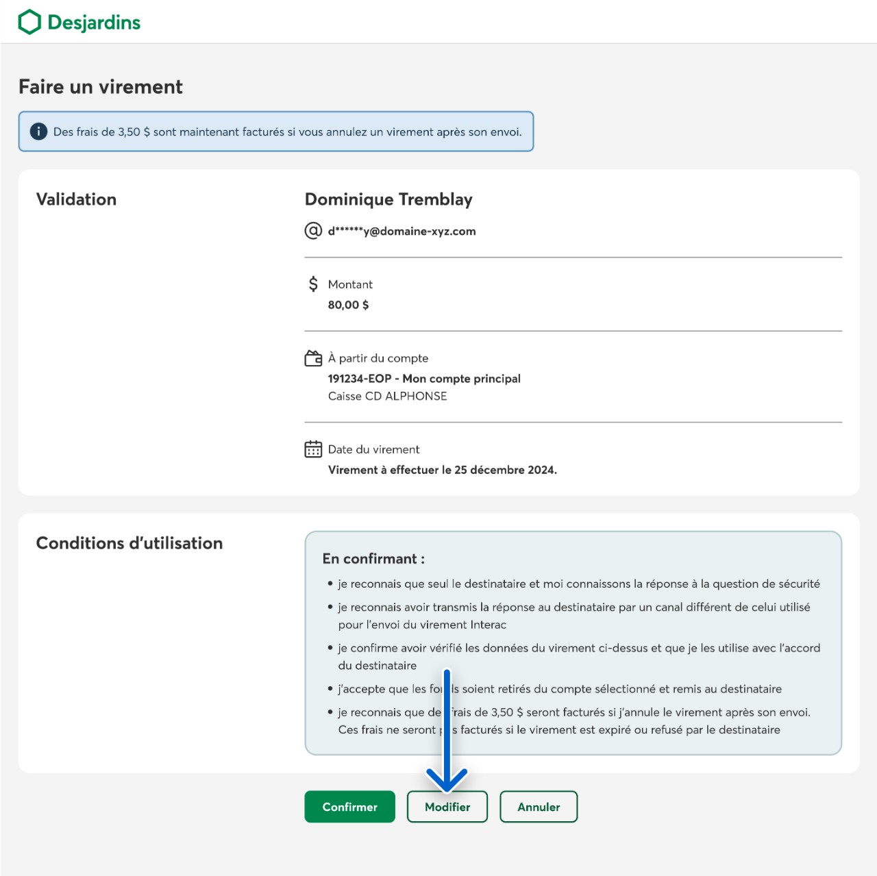 À l’étape de validation, vérifiez les informations de la transaction. Vous pouvez changer ces informations en sélectionnant le bouton Modifier.