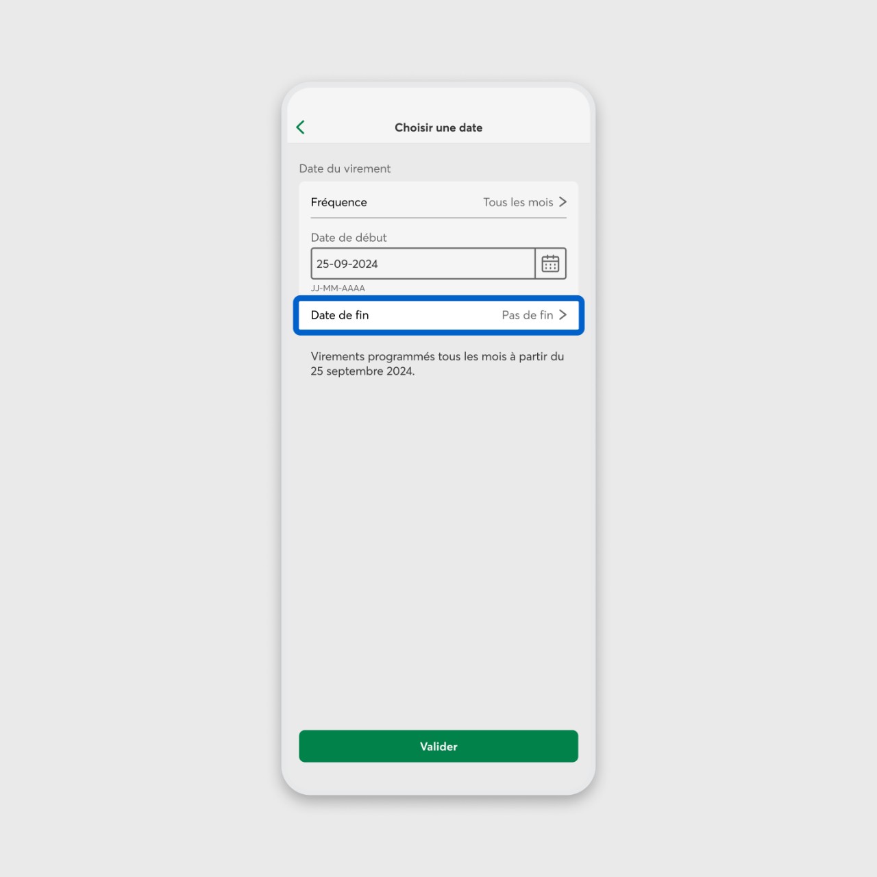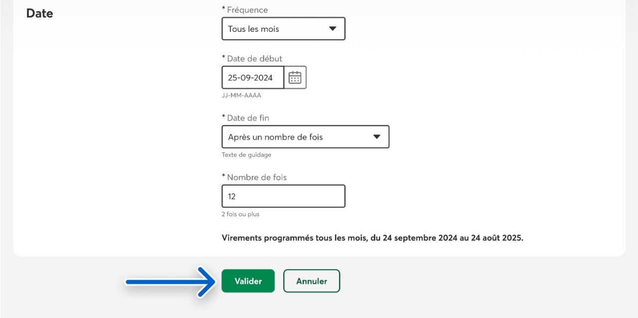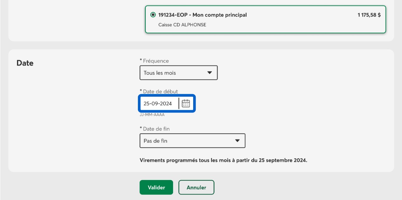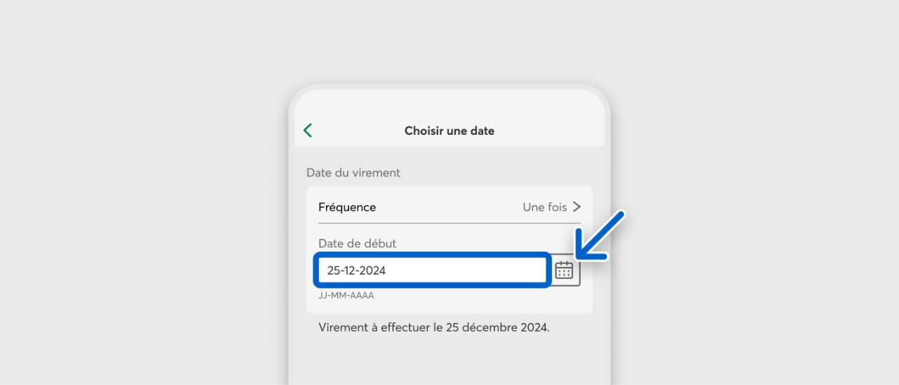 Dans le champ Date de début, entrez la date du premier virement au format JJ-MM-AAAA (exemple : 26-02-2024). Vous pouvez aussi sélectionner le bouton pour choisir une date dans le calendrier.