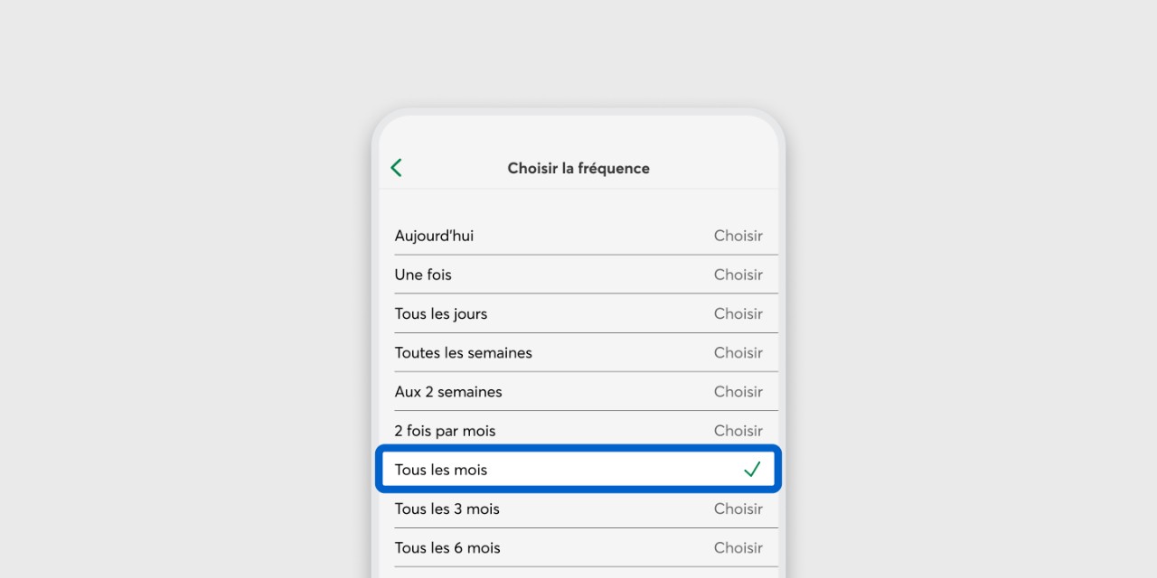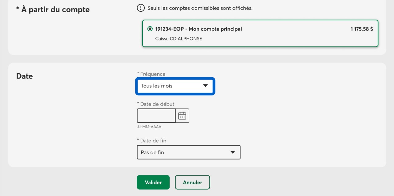 Quand vous êtes à l’étape de choisir une date pour faire votre Virement Interac, sélectionnez la fréquence souhaitée dans la liste déroulante.