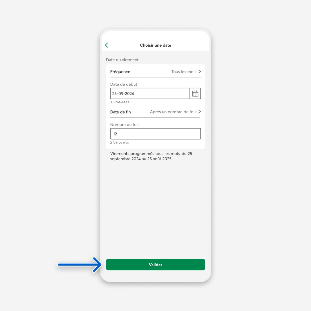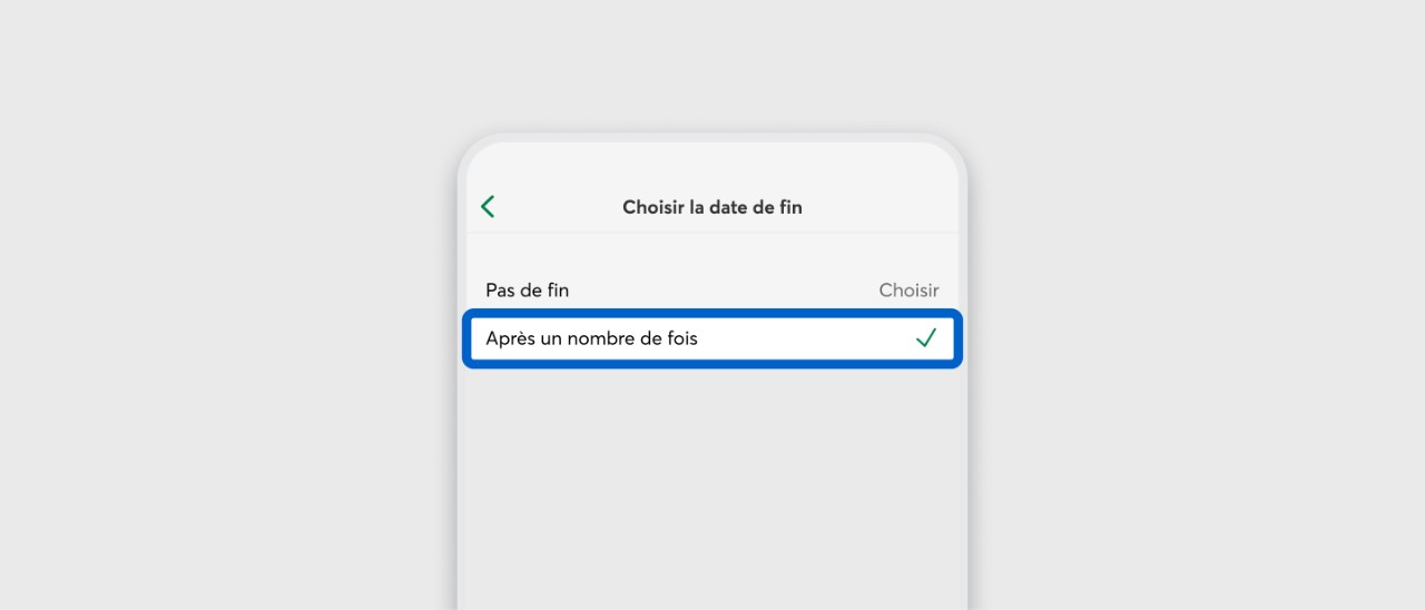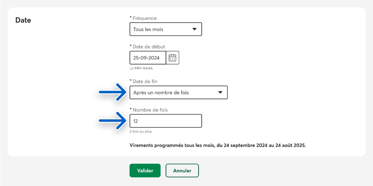 Pour que le virement se renouvelle sans fin, sélectionnez Pas de fin. Pour qu'il se renouvelle 2 fois ou plus, sélectionnez Après un nombre de fois, puis entrez le nombre de fois souhaité.