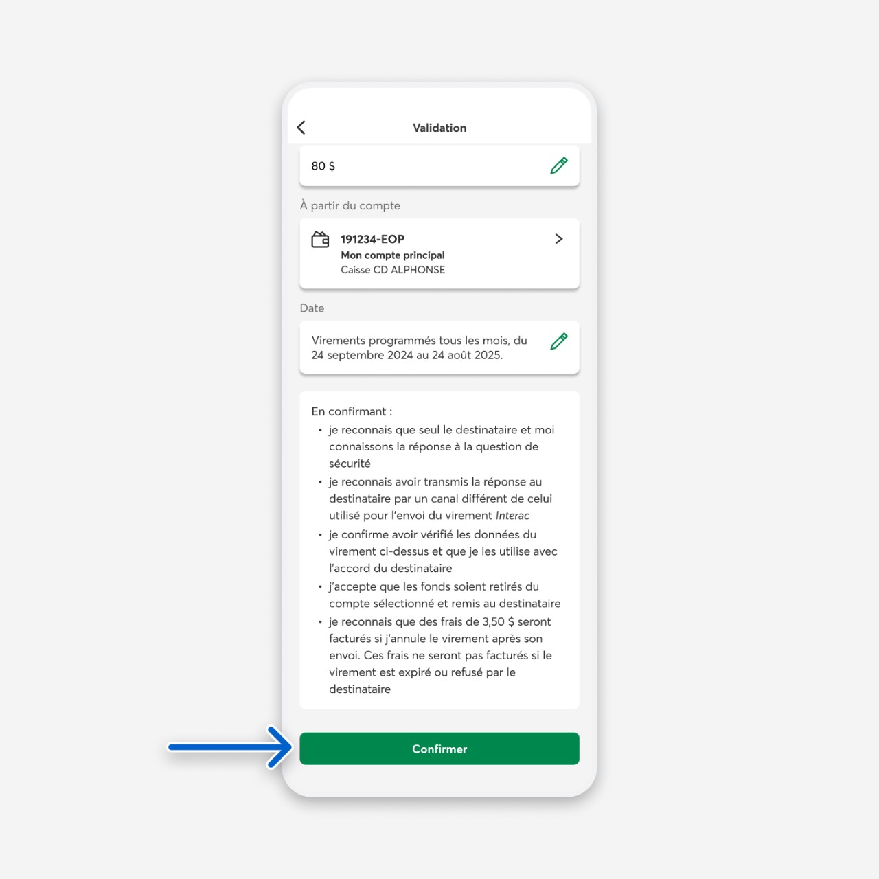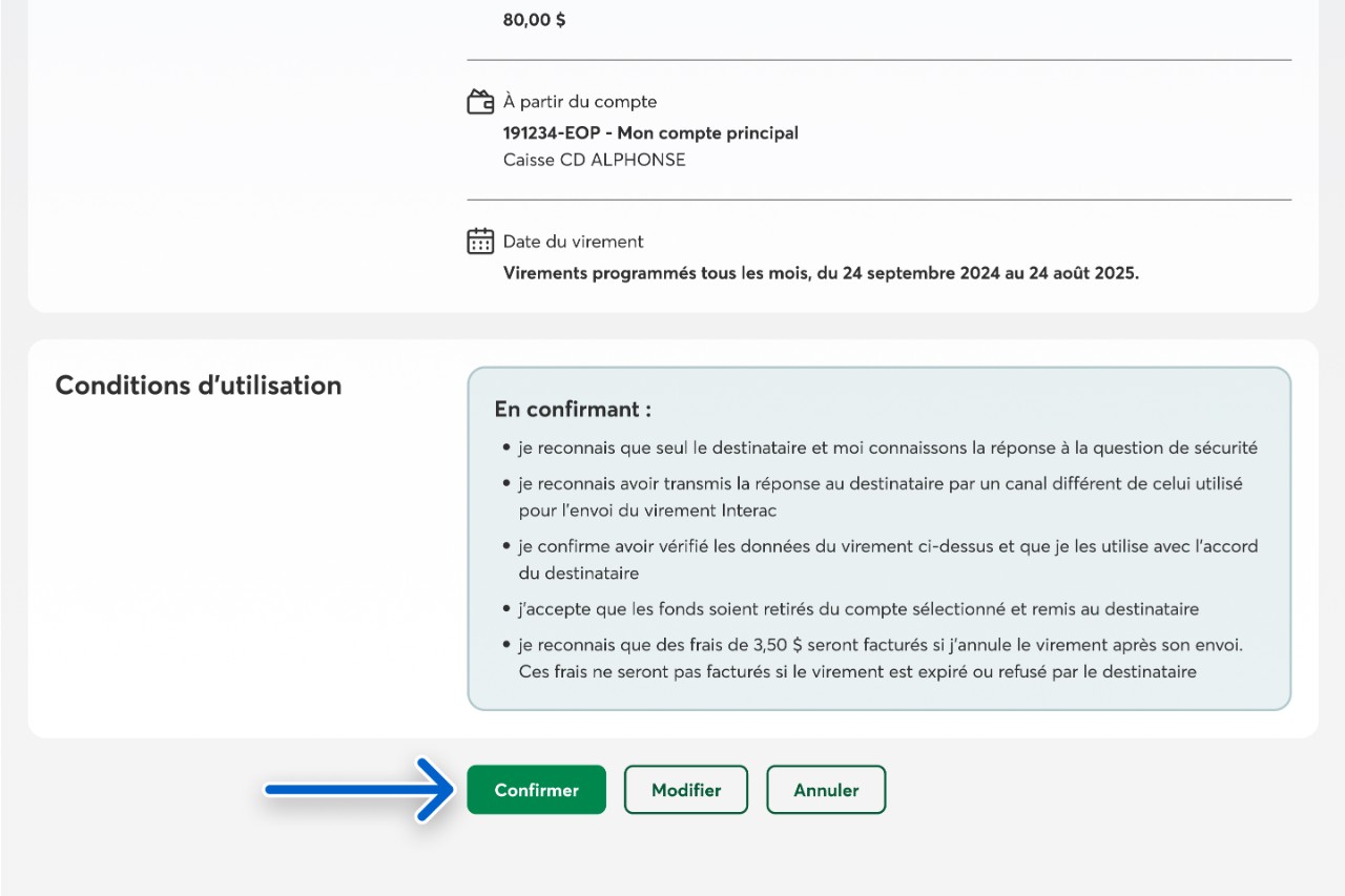 Sélectionnez le bouton Confirmer pour programmer votre Virement Interac.