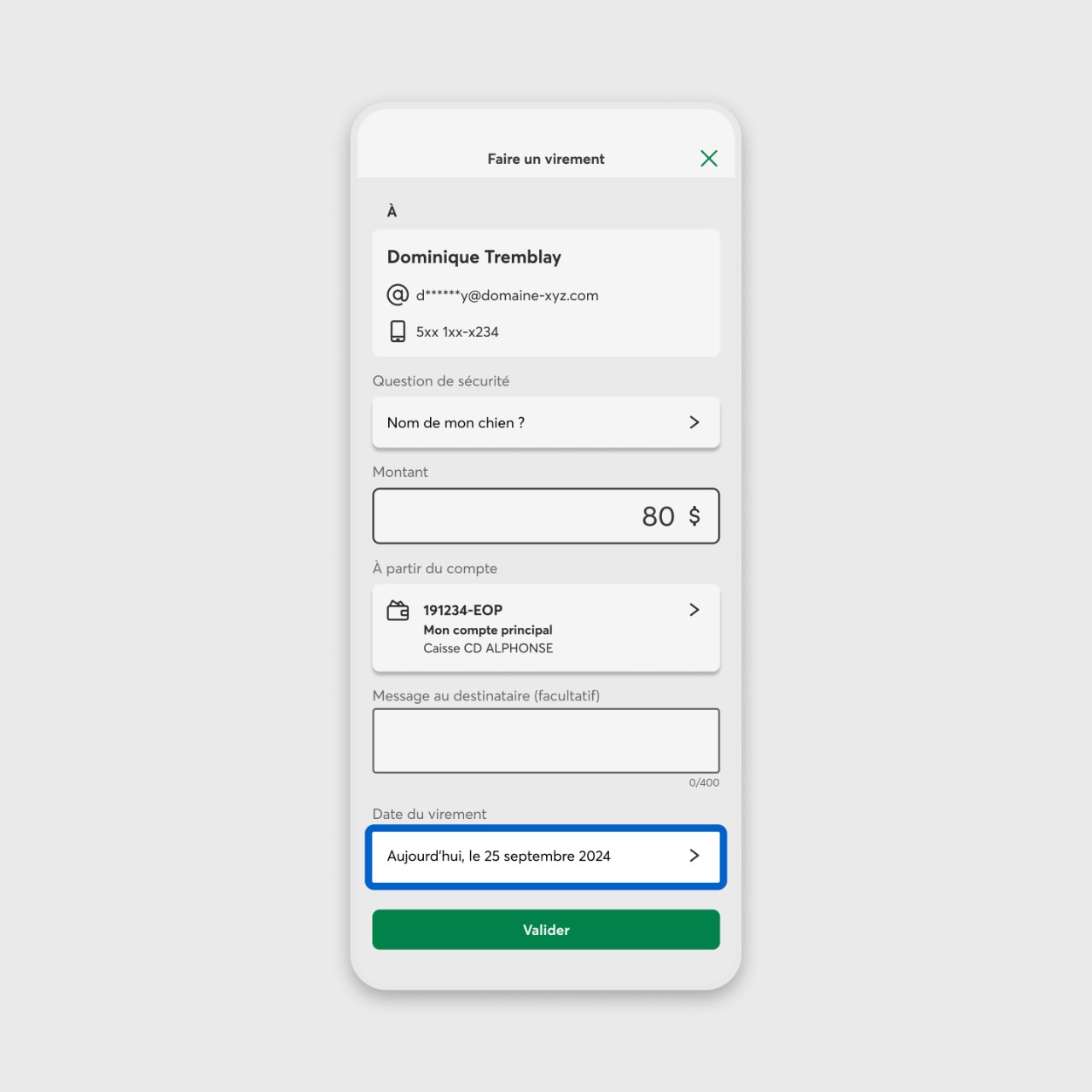 Quand vous êtes à l’étape de choisir une date pour faire votre Virement Interac, sélectionnez le bouton de la date du virement.
