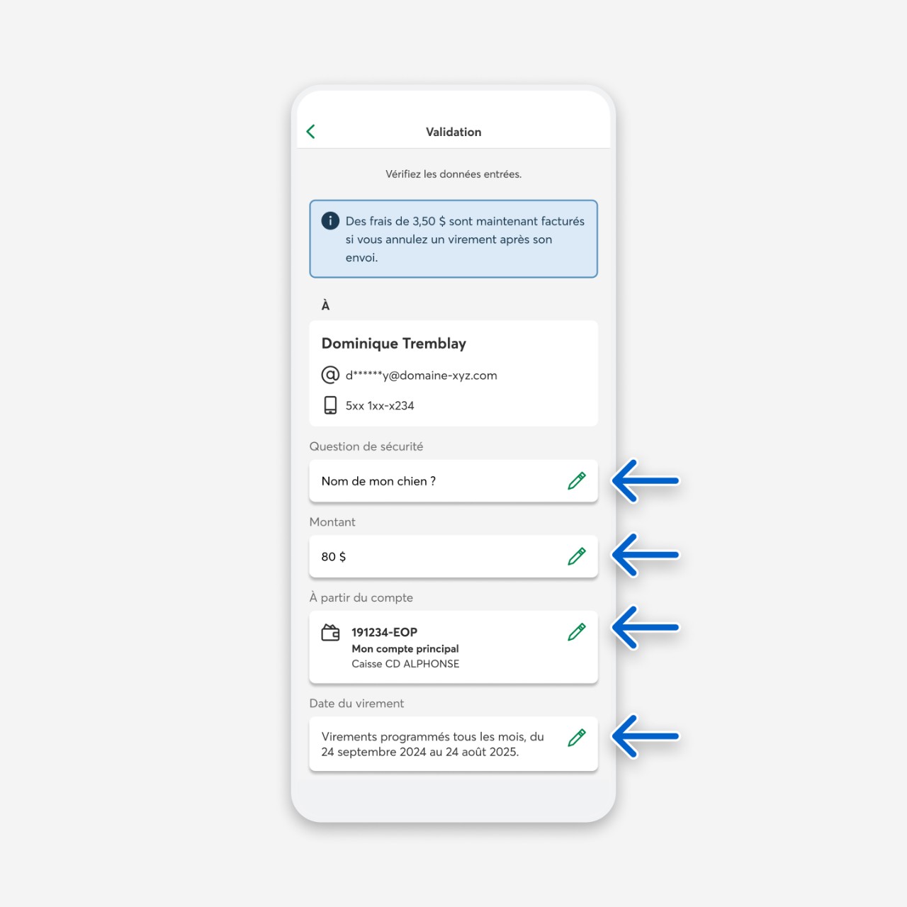 À l’étape de validation, vérifiez les informations de la transaction. Vous pouvez modifier chaque information en sélectionnant le bouton associé (icône de crayon).