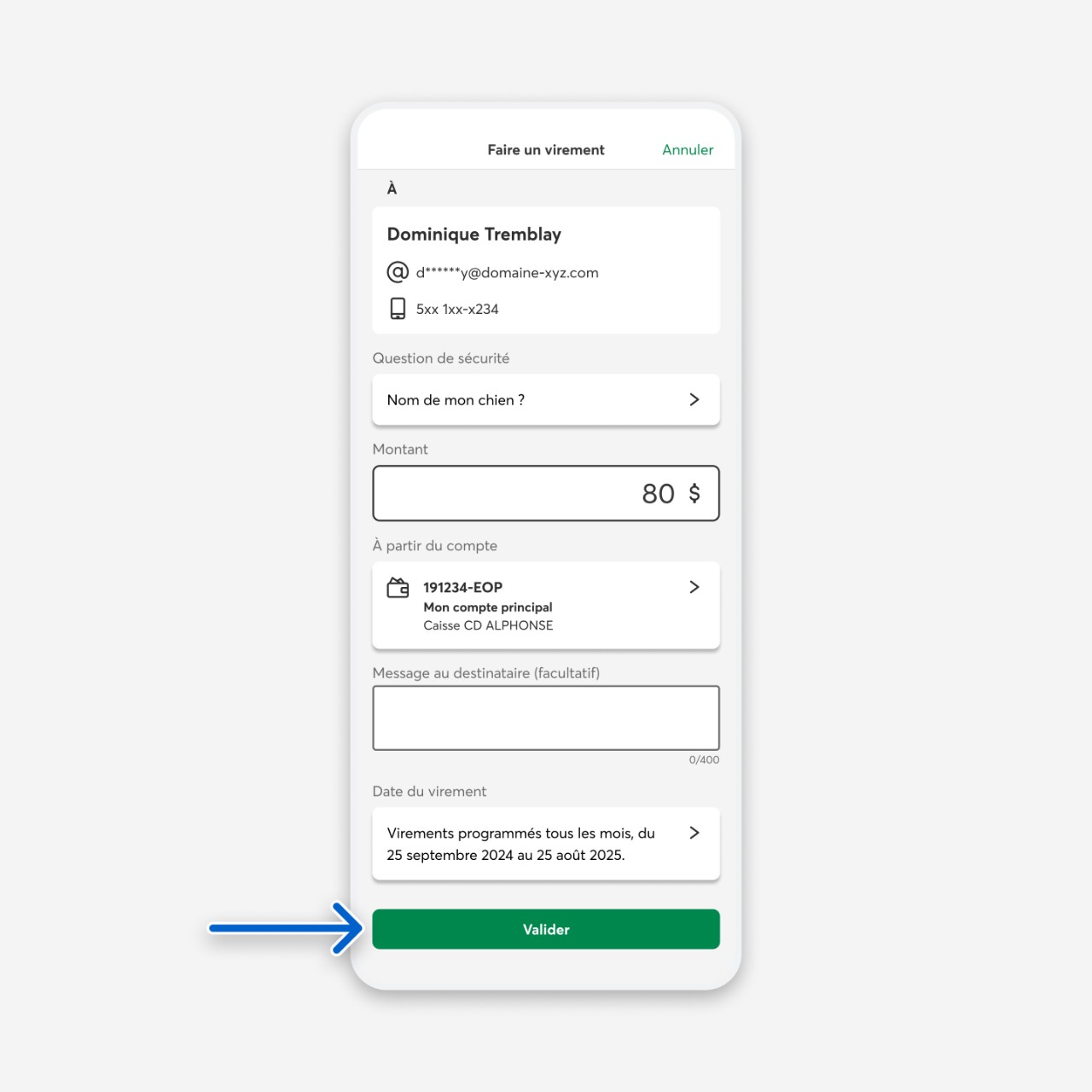 Une fois toutes les informations entrées dans la page Faire un virement, sélectionnez le bouton Valider.