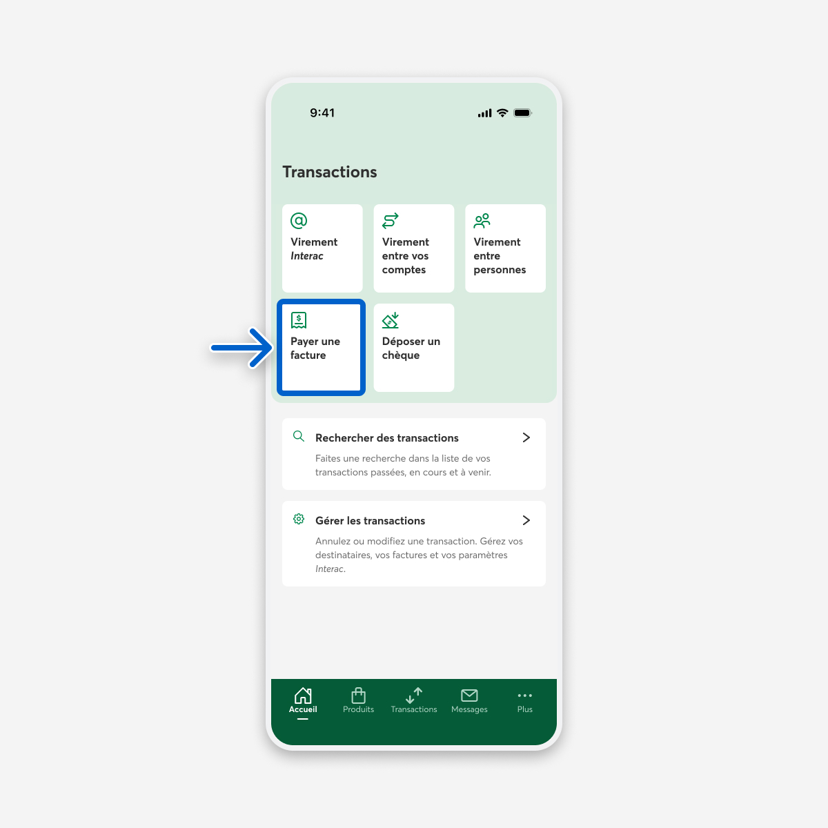 Dans la page Transactions, sélectionnez le bouton Payer une facture.