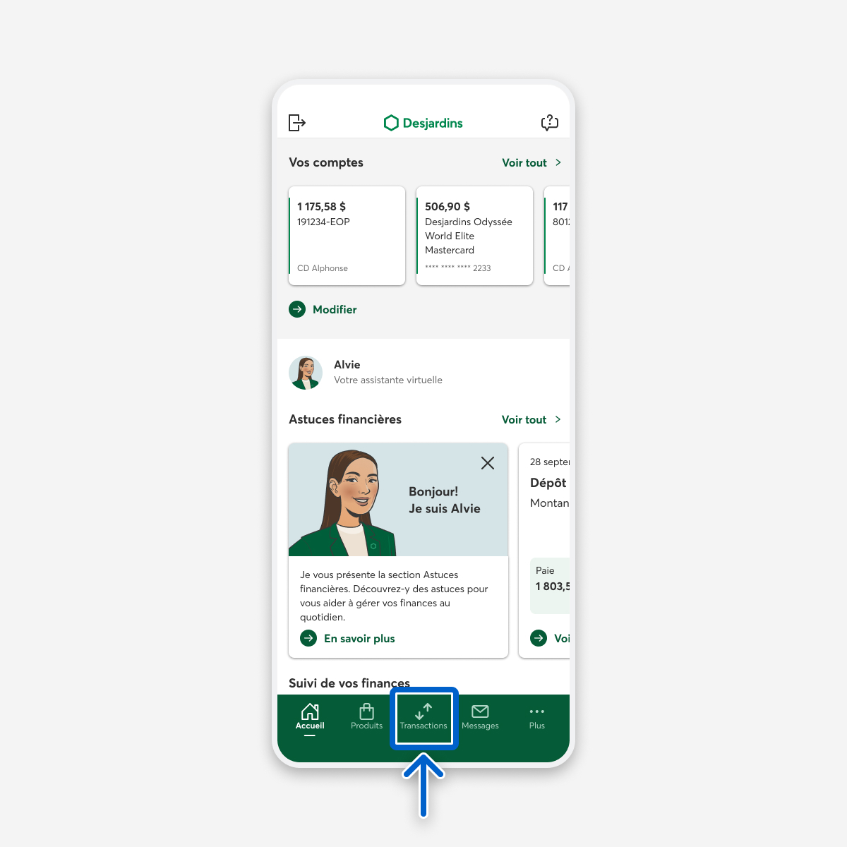 Connectez-vous à l’application Services mobiles Desjardins, puis sélectionnez l’onglet Transactions.