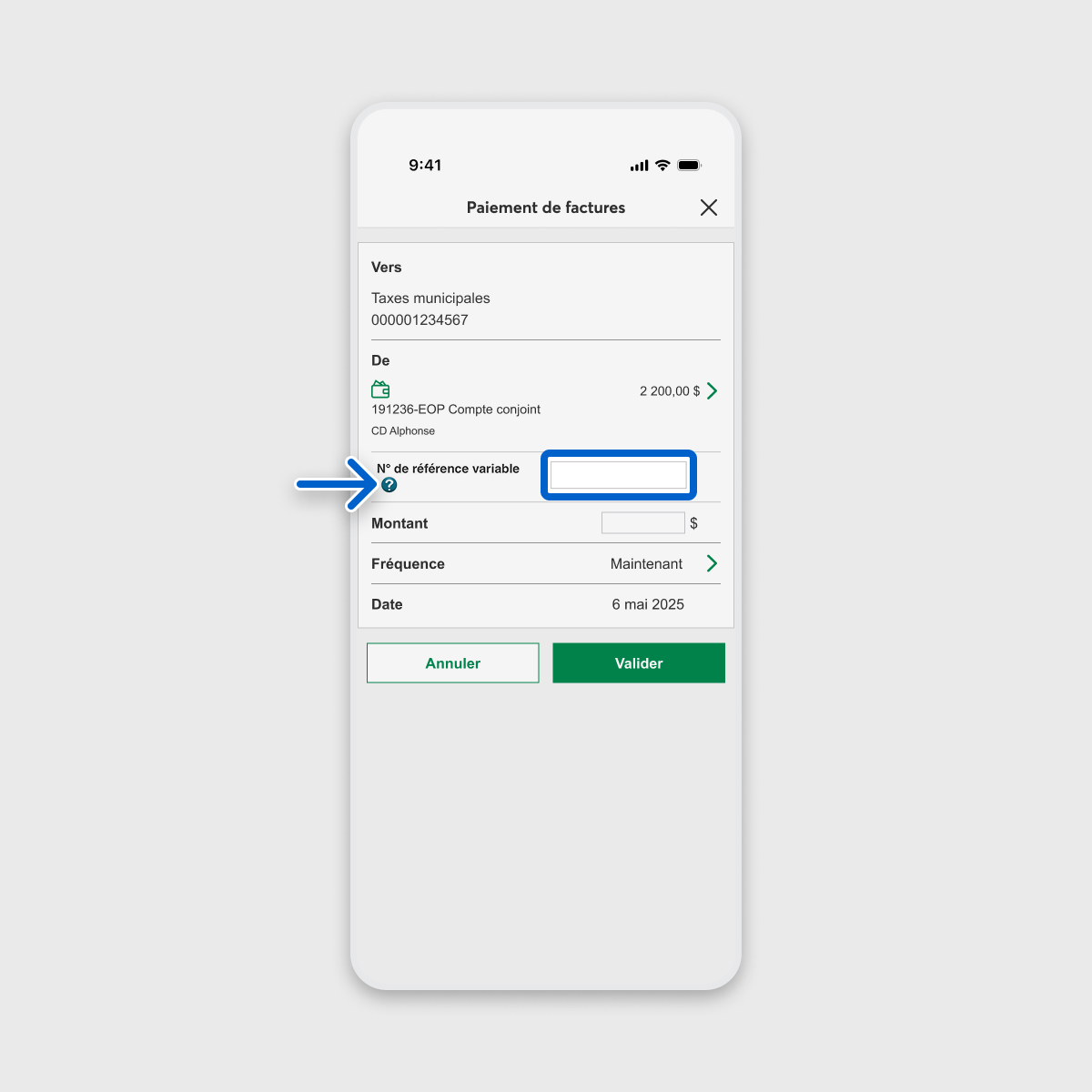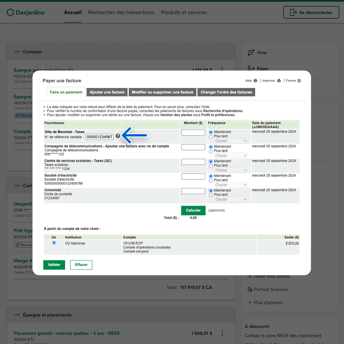 Entrez le numéro de référence de votre facture dans le champ Numéro de référence, s’il y a lieu. Pour trouver le numéro de référence de votre facture, sélectionnez l’image cliquable Aide.