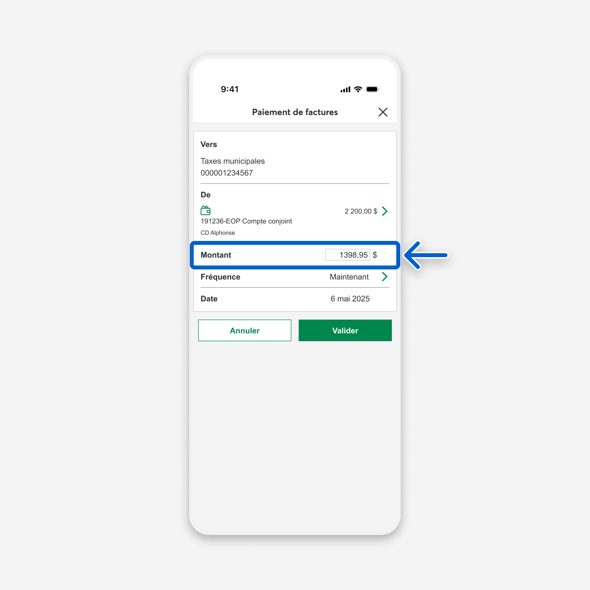 La date du paiement est celle du jour par défaut. Vous pouvez programmer le paiement de votre facture à la date et à la fréquence de votre choix.