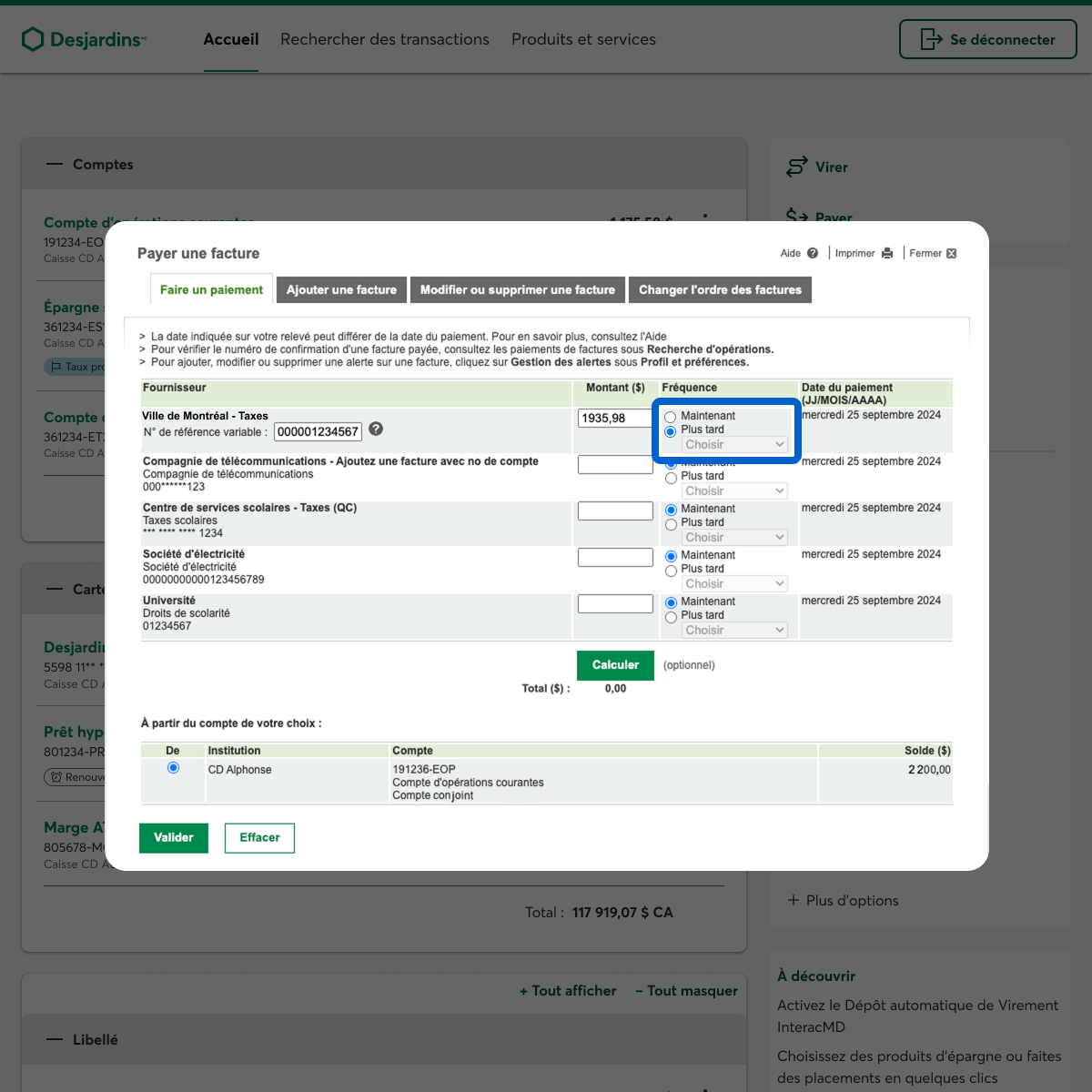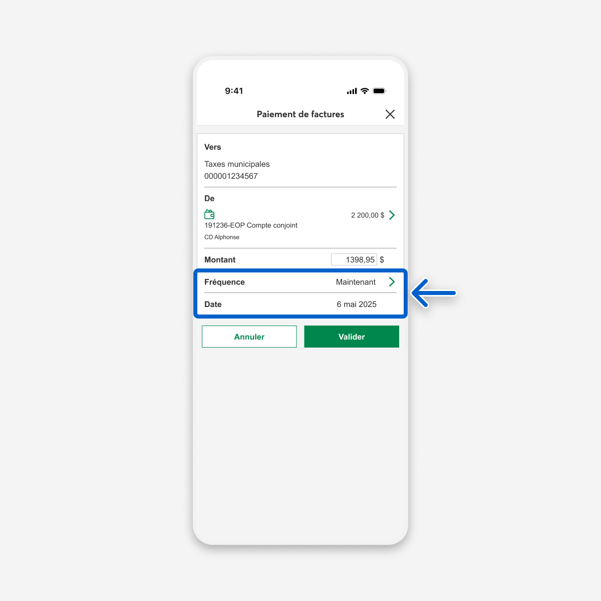 La date du paiement est celle du jour par défaut. Sélectionnez la fréquence souhaitée dans la liste. Vous pouvez programmer le paiement de votre facture à la date et à la fréquence de votre choix.