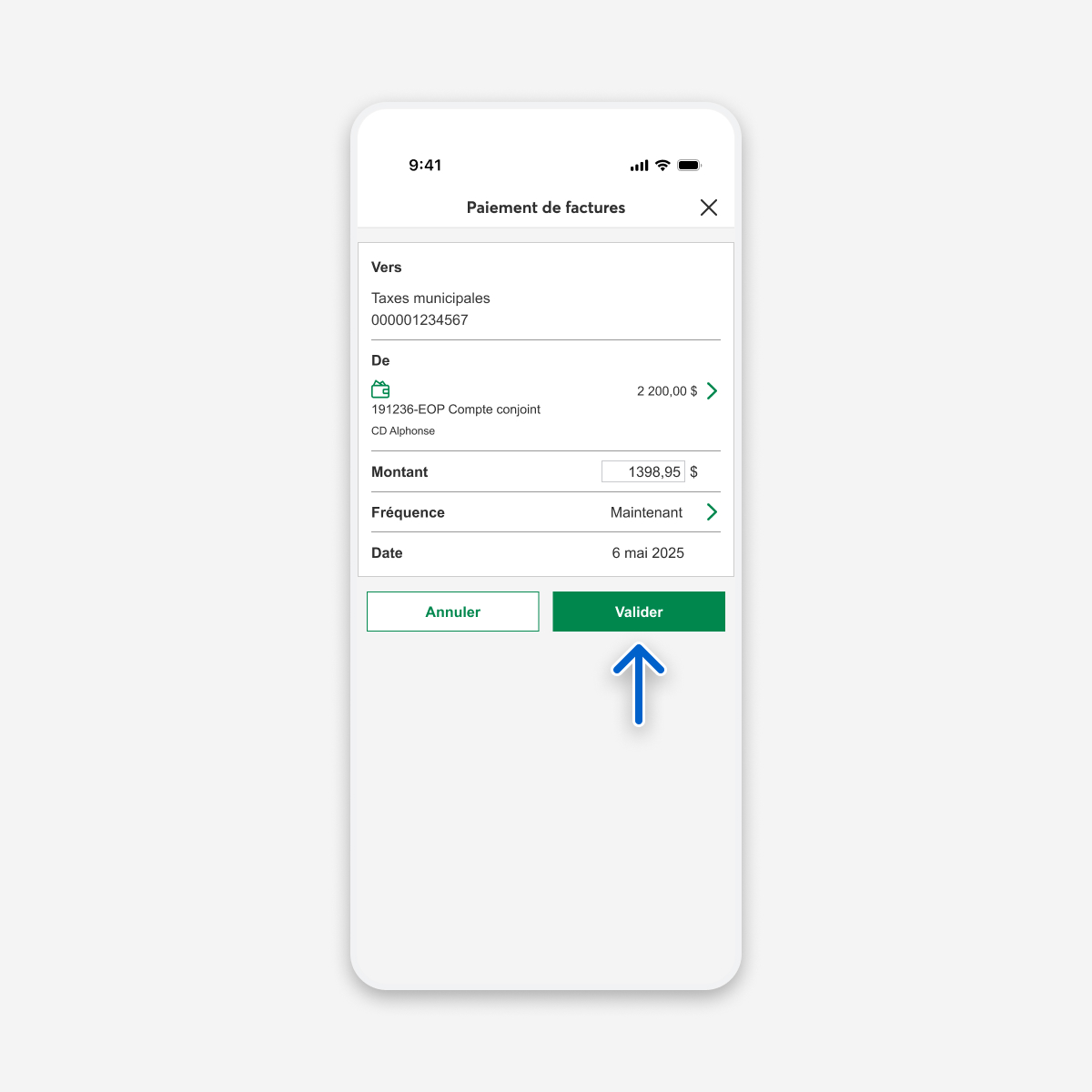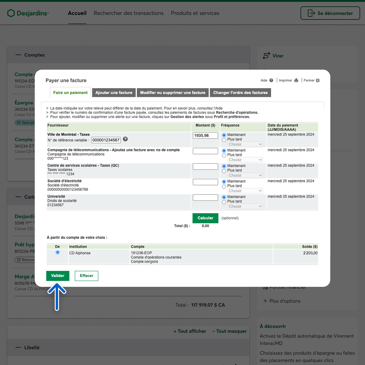 Une fois toutes les informations entrées dans la page Paiement de factures, sélectionnez le bouton Valider.