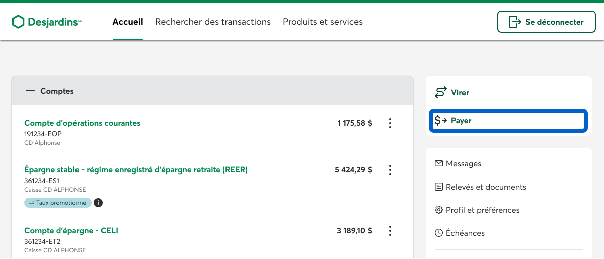 Connectez-vous à AccèsD. Dans la page d’accueil, sélectionnez le bouton Payer.