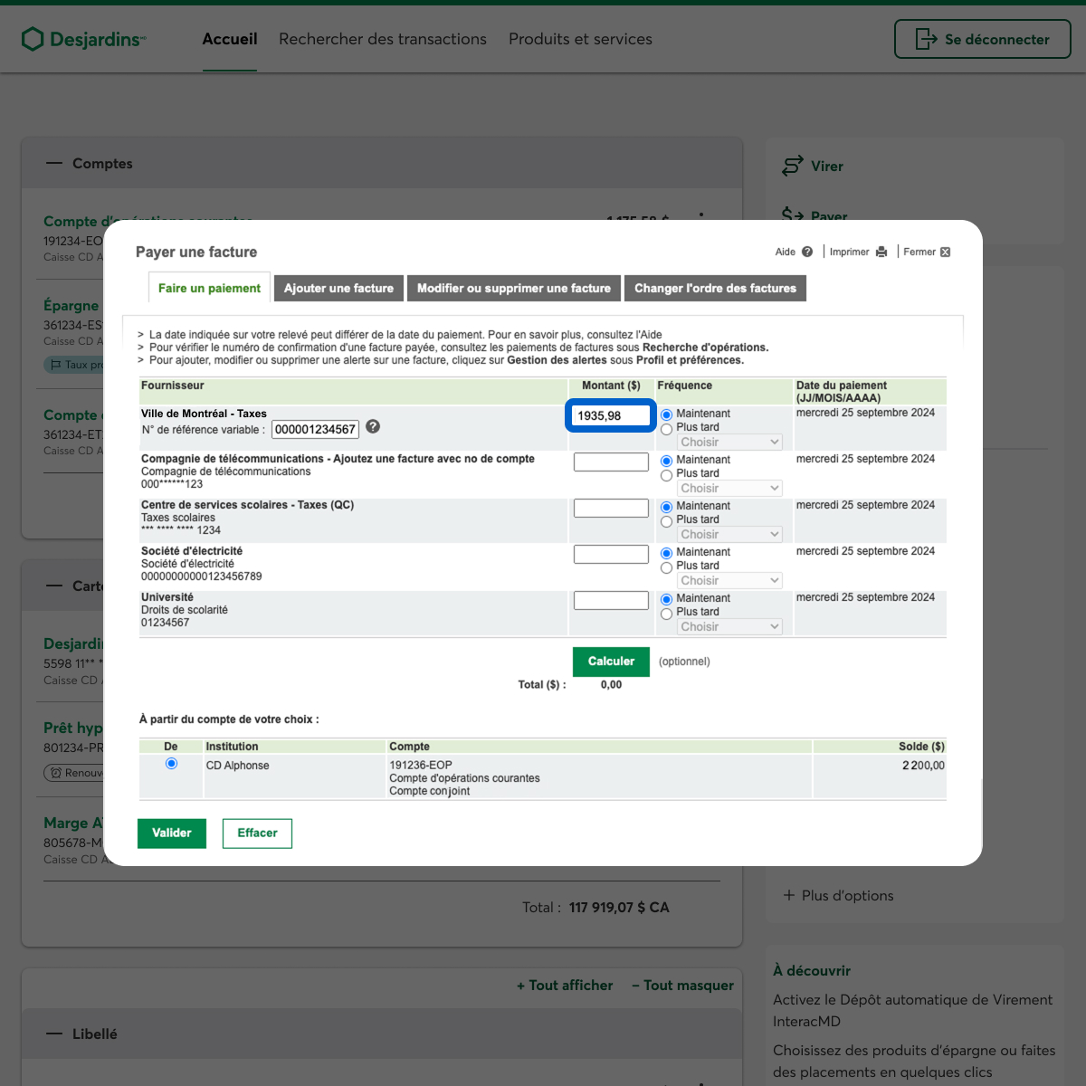Si vous payez plus d’une facture à la fois, sélectionnez le bouton Calculer pour connaître le montant total des paiements à faire.