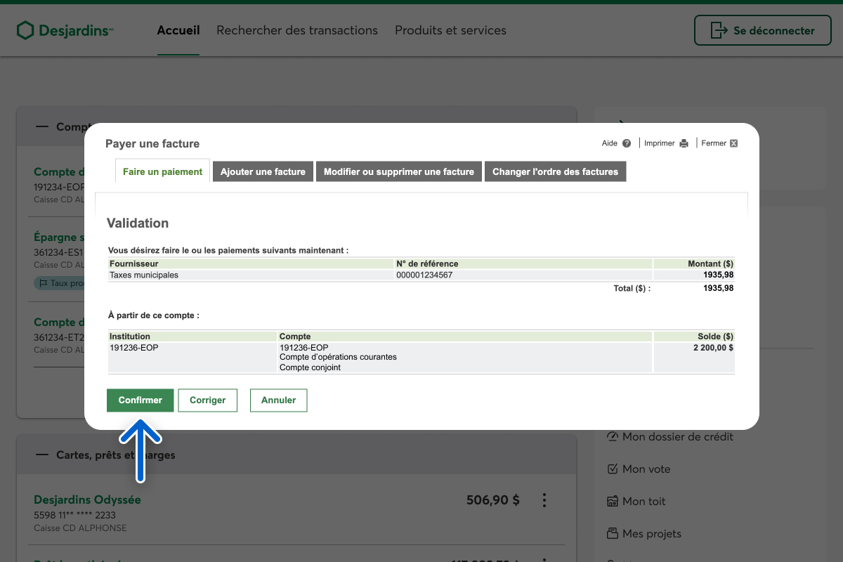 Dans la page Validation, vérifiez les informations de la facture à payer, puis sélectionnez le bouton Confirmer.