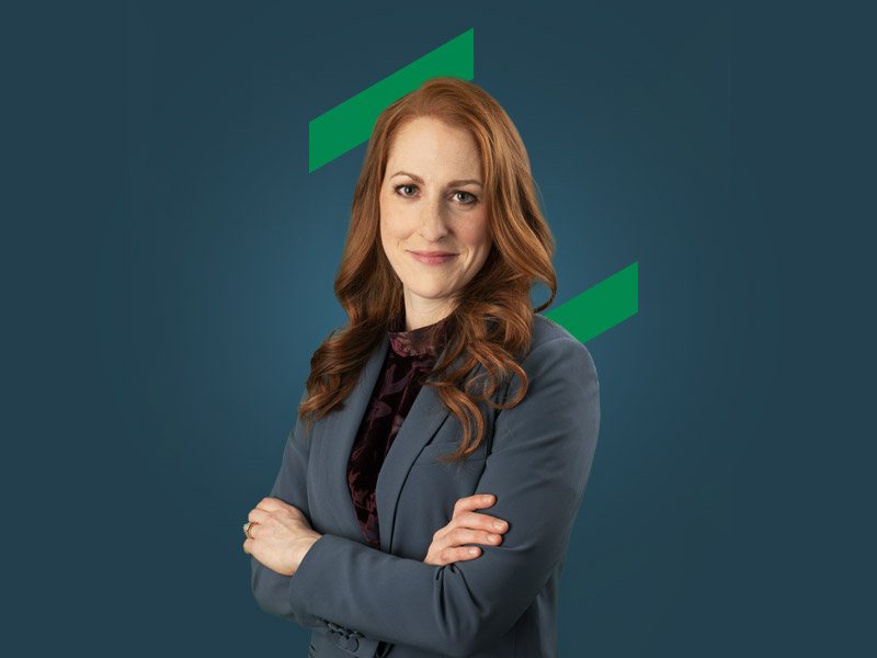 [Ouverture du bandeau vert de Desjardins sur une femme dans un bureau,]