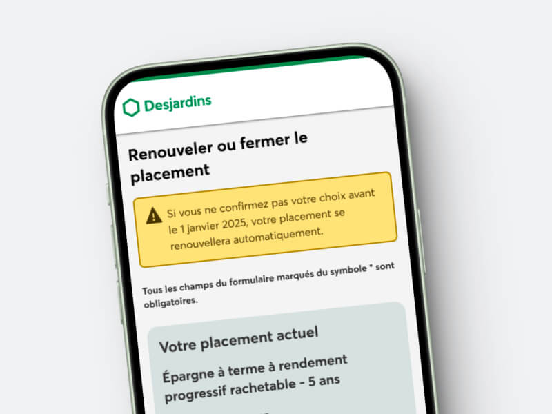Vous pouvez renouveler votre épargne à terme 60 jours avant son échéance dans AccèsD, si elle y est admissible (voir comment faire pour renouveler votre épargne à terme).