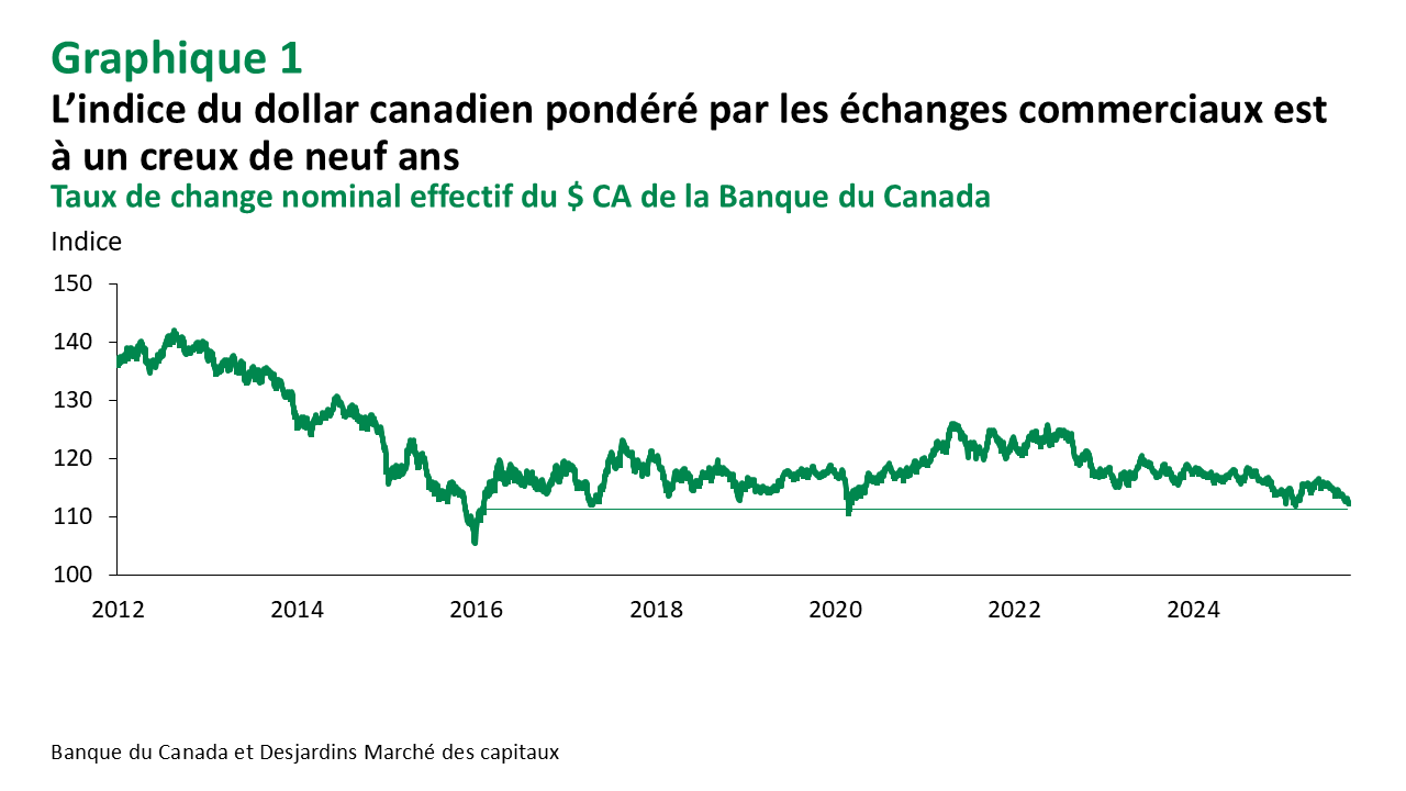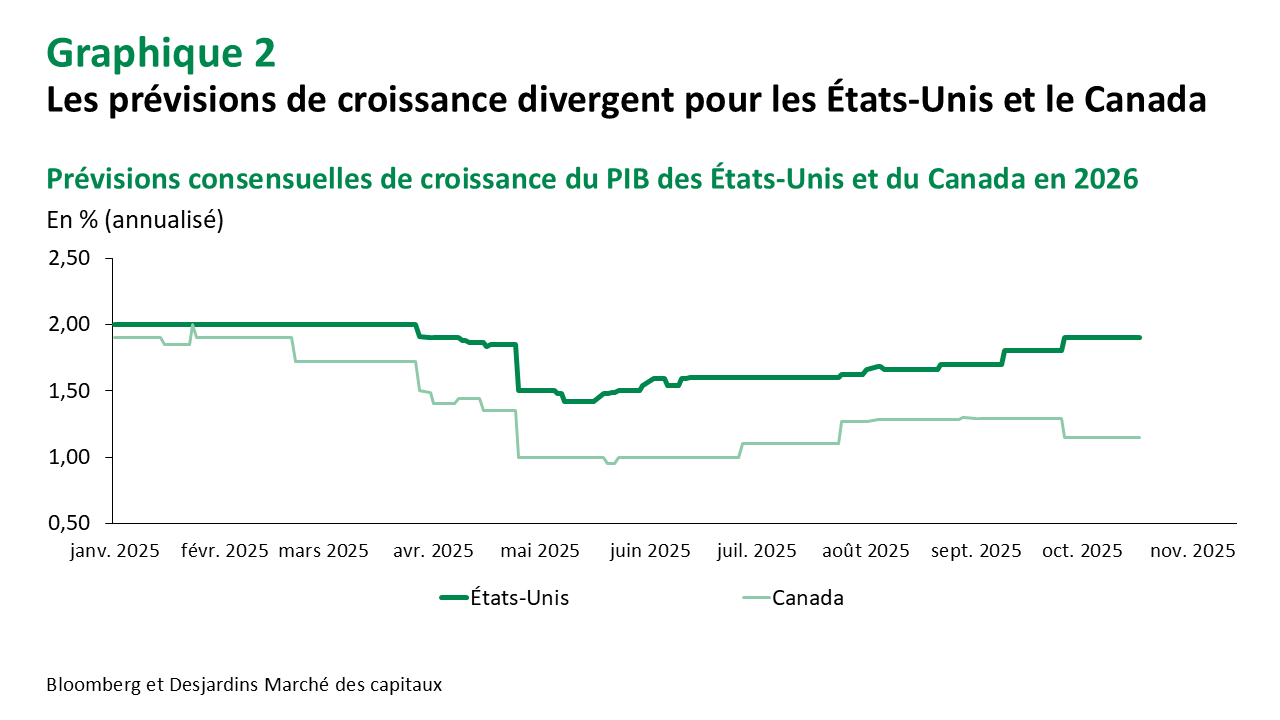 Qu’est-ce que cela signifie pour les perspectives? Notre prévision de 1,35 à la fin de l’année pour l’USD‑CAD semble désormais inatteignable. Nous avons modifié nos prévisions et sommes maintenant d’avis que le dollar canadien demeurera faible au cours des deux prochains trimestres, avant de se redresser graduellement vers la fin de 2026.