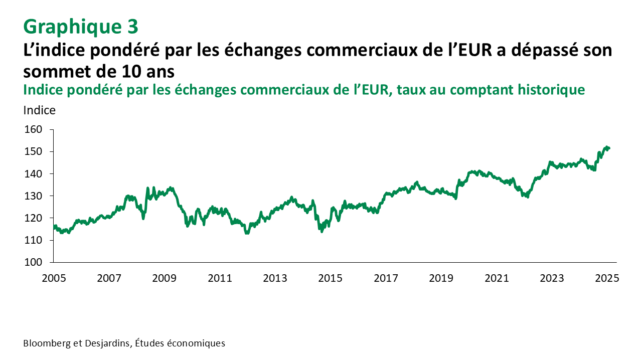 À notre avis, ces pressions se sont largement estompées. L’érosion de la crédibilité des institutions américaines inquiète peut‑être les investisseurs, mais ceux‑ci sont prêts à passer outre, du moins pour le moment. Les achats d’actions américaines ont repris, signalant un regain d’appétit pour les actifs américains.