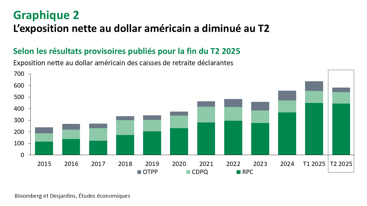 Six des huit grandes caisses de retraite canadiennes publient leur exposition aux devises. Quatre d’entre elles (le RPC, la CDPQ, l’OTPP et l’OMERS) ont publié des mises à jour de mi‑année couvrant les données jusqu’à la fin juin.