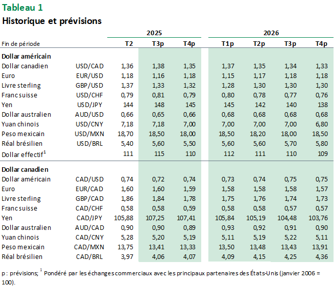 Nous nous attendons à ce que le dollar américain fasse du surplace ou recule d’ici la fin de l’année. Nos prévisions laissent également entrevoir un dollar américain plus faible l’an prochain, mais notre conviction à cet égard est faible.
