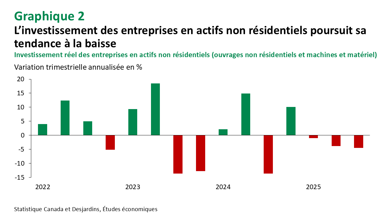 Pour la suite, il faudra probablement du temps pour que l’investissement des entreprises se redresse après le frein induit par l’incertitude observée de janvier à septembre. En effet, selon la Banque du Canada Lien externe au site., les intentions d’investissement pour les 12 prochains mois sont demeurées au même faible niveau au troisième trimestre qu’au deuxième. Cependant, le budget fédéral récemment adopté Lien externe au site. introduit des mesures qui devraient encourager la croissance des dépenses en immobilisations des entreprises, notamment la « superdéduction pour la productivité », qui permet l’amortissement accéléré des actifs favorisant la productivité ainsi que des machines et du matériel de fabrication.