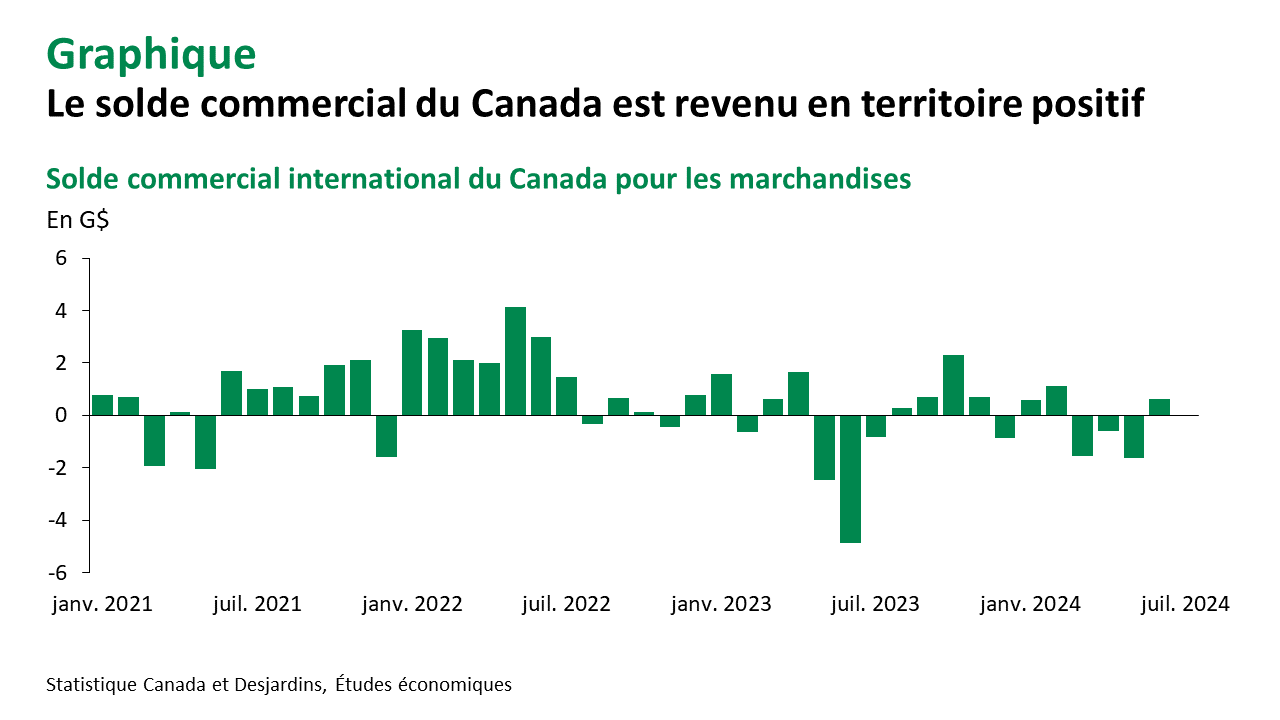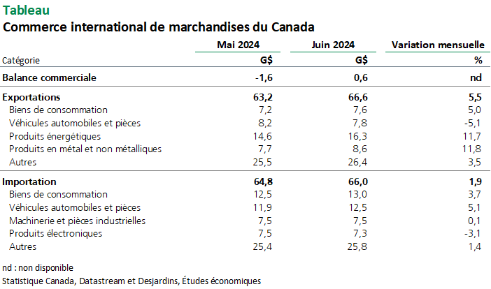 - Le solde commercial international du Canada pour les marchandises est revenu en territoire positif, en passant de -1,6 G$ en mai à 0,6 G$ en juin. Ce résultat est nettement supérieur au consensus, qui estimait un déficit de 2 G$ pour le mois.