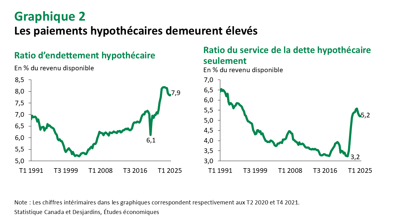 - Le ratio du service de la dette des ménages – soit la part du revenu disponible consacrée au remboursement de la dette – a augmenté pour la première fois en six trimestres, atteignant 14,4 %. Ce niveau est proche du sommet sans précédent de 15,1 % enregistré au T4 2023. La hausse des paiements hypothécaires au renouvellement semble en être la cause, les paiements d’intérêts ayant augmenté de 0,9 %, tandis que les paiements de capital sont demeurés stables. Le ratio du service de la dette hypothécaire s’est établi à près de 7,9 % au deuxième trimestre, légèrement sous le sommet de 8,2 % de la fin de 2023, mais à un niveau toujours élevé (graphique 2).