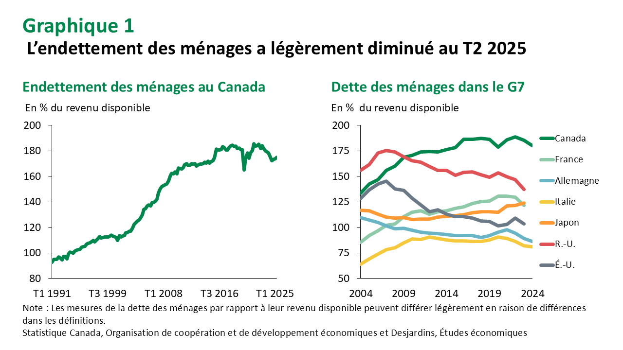 La publication du bilan du T2 2025 montre clairement que, bien que les finances des ménages canadiens aient progressé au cours du trimestre, les gains n’ont probablement pas été répartis équitablement. Les 20 % les plus riches des ménages détenaient près de 70 % des actifs financiers et ont donc été les principaux bénéficiaires de la hausse de 291 G$ des actifs financiers. Le taux d’épargne Lien externe au site. a poursuivi sa baisse au deuxième trimestre, passant de 7,2 % au T3 2024 à 5,0 %, alors que les dépenses des ménages Lien externe au site. ont augmenté plus rapidement que leur revenu disponible. En effet, les dépenses de consommation des ménages canadiens ont progressé à un rythme annualisé solide de 5,0 % au T2, malgré les incertitudes liées aux tensions commerciales et au ralentissement de la croissance démographique.