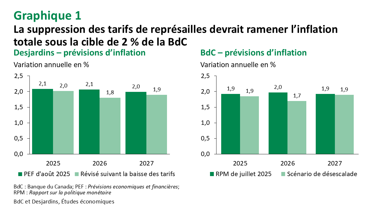 - Enfin, « la décision récente du gouvernement fédéral de retirer la majorité des tarifs de représailles sur les biens importés des États‑Unis devrait réduire les pressions haussières sur les prix de ces produits à l’avenir ». Selon nos estimations Lien externe au site., cela pourrait retrancher environ 0,3 point de pourcentage à l’inflation totale de l’IPC en 2026, et 0,1 point en 2027 (graphique 1). L’inflation se rapprocherait ainsi du scénario de désescalade présenté par la BdC en juillet. Cela dit, le Conseil de direction a également précisé que les répercussions inflationnistes du conflit commercial en cours demeurent très incertaines.
