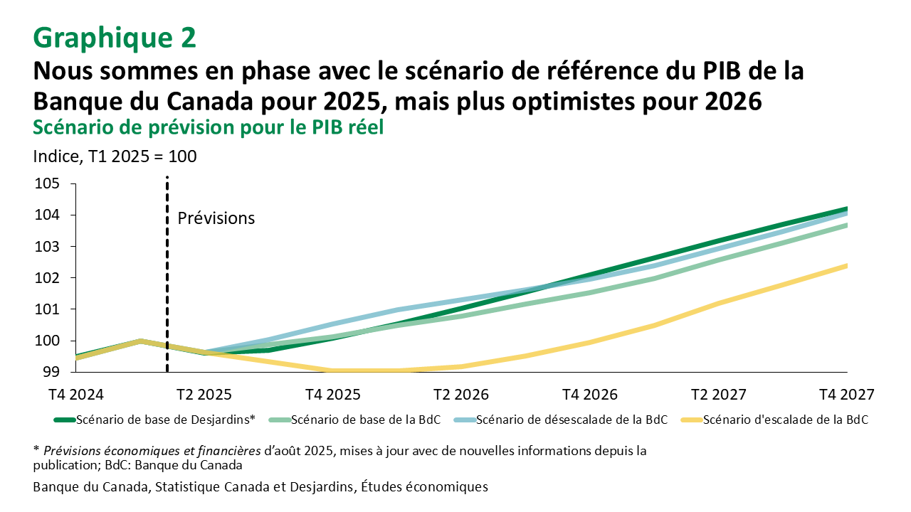 Nous croyons que cette décision contribuera à ramener l’inflation sur une trajectoire plus proche du scénario de désescalade de la BdC, et que la croissance économique finira également par converger vers ce scénario (graphique 2). Cela dit, notre prévision du PIB réel tient également compte des mesures budgétaires fédérales Lien externe au site. prévues, lesquelles étaient visiblement absentes des déclarations d’aujourd’hui de la BdC.