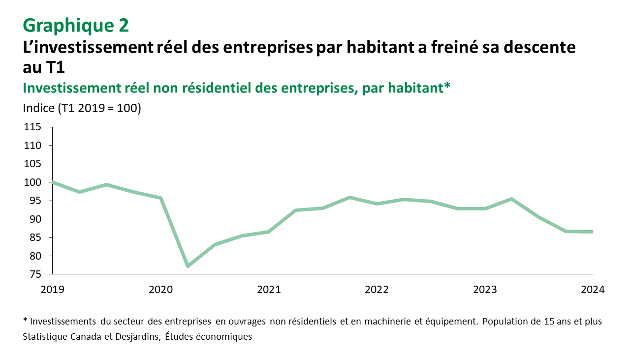 Il faut mettre un petit bémol sur les données globales, cependant : l’investissement réel des entreprises par habitant stagne, et il demeure nettement inférieur aux niveaux prépandémiques. Il a au moins cessé sa descente au T1 (graphique 2). Se sortir de cette mauvaise passe ne sera pas chose facile, mais c’est une étape essentielle pour remédier au retard de productivité du Canada Lien externe au site..