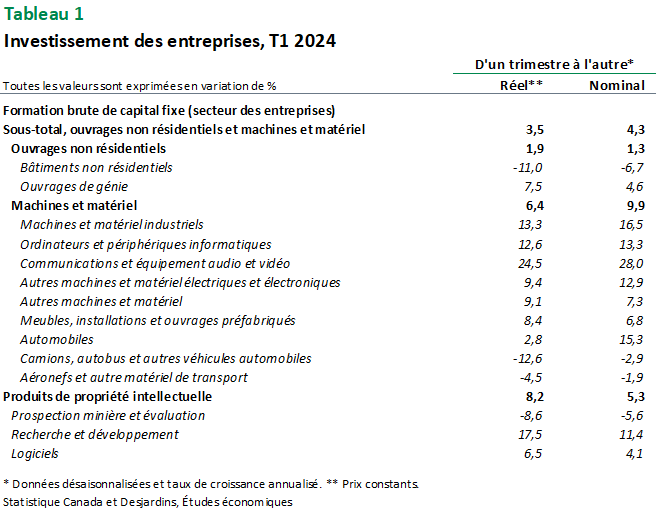 - En parallèle, les investissements non résidentiels des entreprises ont rebondi au T1 après des résultats décevants à la fin de l’année dernière. Les investissements réels et nominaux ont progressé de 3,5 % et de 4,3 % respectivement sur une base trimestrielle annualisée (tableau 1). Les entreprises du secteur pétrolier et gazier ont notamment augmenté leurs investissements dans les ouvrages de génie. La plupart des catégories d’investissement ont enregistré des hausses, sauf les bâtiments non résidentiels, les camions et les autobus ainsi que les aéronefs. Il est encourageant de constater que les dépenses en produits de propriété intellectuelle sont également en croissance.
