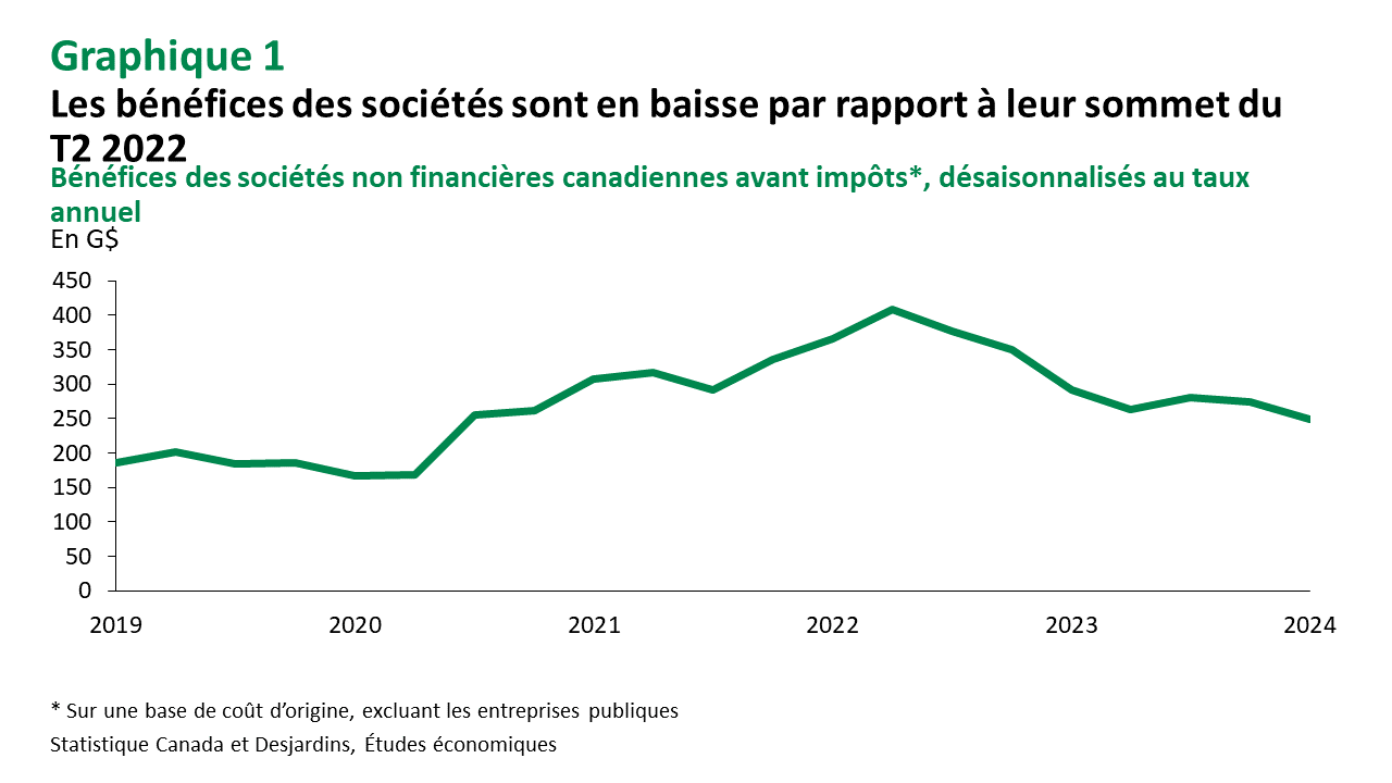 - Les bénéfices des sociétés non financières canadiennes ont chuté de 31,8 % (en variation trimestrielle à rythme annualisé) au T1 2024. Avec les révisions à la baisse des données des trimestres précédents, il s’agit du sixième recul au cours des sept derniers trimestres. Les bénéfices des sociétés avant impôts (sur une base de coût d’origine) sont en forte baisse par rapport à il y a un an (14,5 %). Ils sont maintenant à 39,1 % sous leur sommet du T2 2022 (graphique 1).