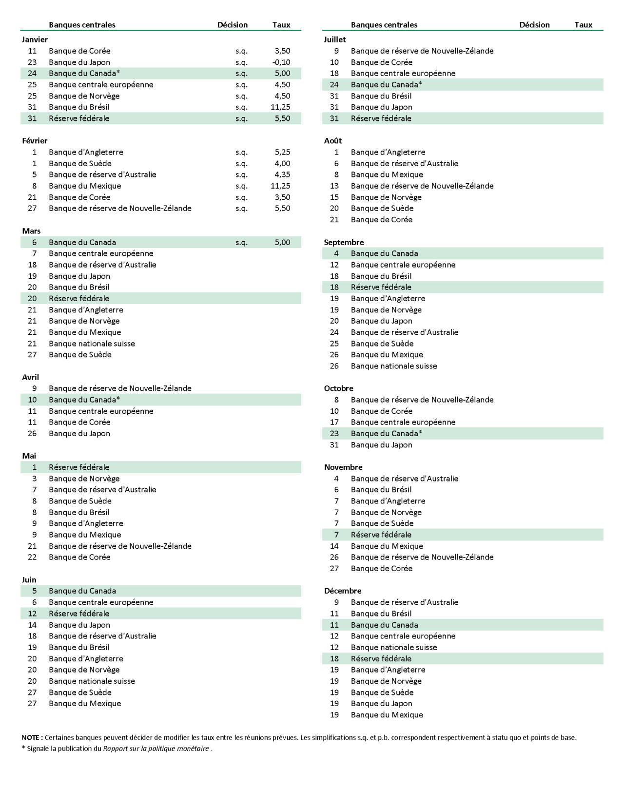 - Le Conseil de direction « demeure préoccupé par les risques entourant les perspectives d’inflation, surtout la persistance de la forte inflation sous-jacente. [Il] veut voir l’inflation fondamentale continuer de baisser, et ce, de façon durable. Il surveille encore de près l’équilibre entre l’offre et la demande, les attentes d’inflation, la croissance des salaires et les pratiques d’établissement des prix des entreprises ».