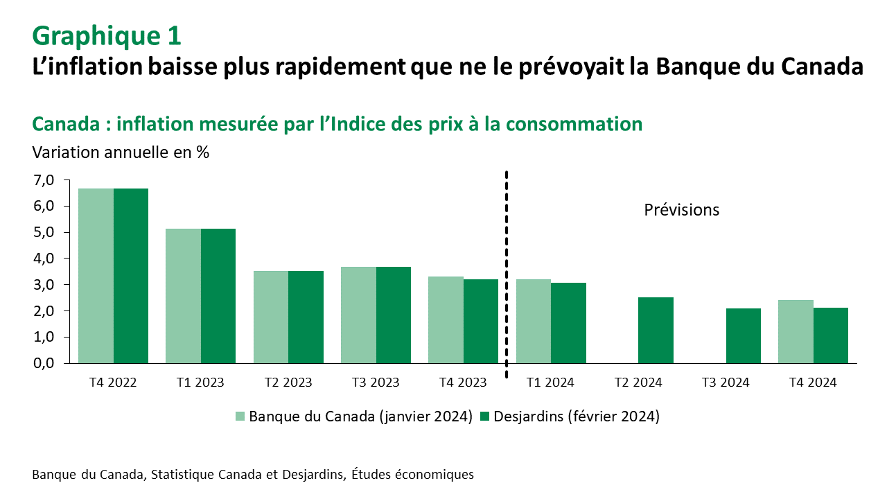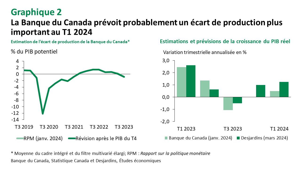 Fait important, l’inflation est inférieure aux prévisions de la BdC dans le Rapport sur la politique monétaire (RPM) de janvier 2024, une tendance qui devrait, selon nous, se poursuivre (graphique 1). En effet, le principal moteur de l’inflation globale à ce stade-ci est la composante du logement, et à l’intérieur de celle-ci, le coût de l’intérêt hypothécaire reflétant le niveau élevé des taux d’intérêt. Lorsque la BdC commencera à réduire les taux d’intérêt, les pressions sur ce facteur clé de la croissance des prix commenceront à s’atténuer. Notre équipe de la stratégie macroéconomique a également fait remarquer que les mesures privilégiées de l’inflation fondamentale utilisées par la BdC, soit la médiane et la moyenne tronquée, sont sujettes à d’importants biais lorsque la distribution de la croissance des prix est fortement déformée, comme elle l’est actuellement. Si l’on tient compte de ce biais, l’inflation fondamentale serait inférieure à 3 %, ce qui la placerait dans la fourchette de 1 à 3 % de la BdC.