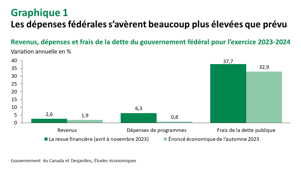 Bien sûr, un déficit budgétaire ne se résume pas à des dépenses de programmes. Les revenus sont légèrement supérieurs aux prévisions, principalement en raison de la hausse de l’impôt sur le revenu des particuliers, des revenus de la taxe sur les produits et services et des primes d’assurance-emploi. Cependant, les frais de la dette publique, soit le coût du service de la dette fédérale, augmentent aussi plus rapidement que prévu dans l’ÉÉA 2023. Tout cela laisse présager que si l’évolution des revenus et des dépenses actuellement estimée dans La revue financière persiste sur tout l’exercice, le déficit passerait de 35,3 G$ l’an dernier à 62,4 G$ pour l’exercice en cours (graphique 2). C’est beaucoup plus que le déficit de 40,0 G$ prévu pour l’exercice 2023‑2024 dans l’ÉÉA. L’augmentation des dépenses de programmes, et plus particulièrement des CPD, est presque la seule responsable de l’érosion des prévisions budgétaires fédérales. C’est donc dire que le gouvernement ne peut pas imputer la détérioration de sa situation budgétaire à la faiblesse de l’économie.