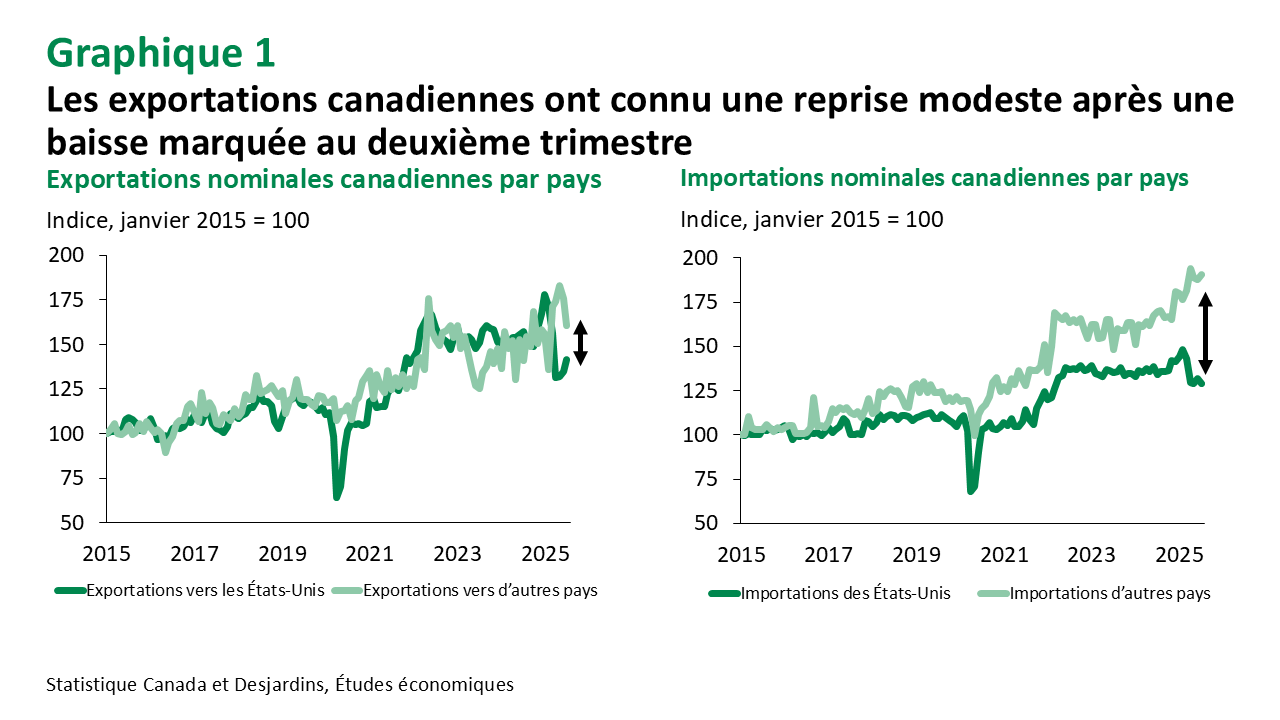 Les chiffres nous donnent cependant un peu plus de raisons d’afficher un optimisme prudent en ce qui concerne l’économie canadienne. Par exemple, les volumes de ventes du secteur manufacturier ont augmenté en juillet pour la première fois depuis janvier. Les volumes du commerce de gros ont également progressé au cours du mois, après une forte remontée en juin. Cela correspond au changement de tendance observé dans les volumes d’exportations Lien externe au site. en juillet (graphique 1), ce qui concorde avec nos constatations Lien externe au site. selon lesquelles la fabrication et le commerce de gros figuraient parmi les secteurs les plus vulnérables à la fluctuation des flux commerciaux avec les États‑Unis. Une production nettement plus élevée d’automobiles et de camions a probablement contribué à la progression en juillet, en tenant compte de la saisonnalité. Les données désaisonnalisées montrent que les chargements ferroviaires et les volumes d’exportations de pétrole brut vers les États‑Unis ont également augmenté au cours du mois, chacun affichant une nouvelle hausse en août. Et ce, malgré le fait que la production de pétrole brut a probablement diminué au cours de l’été en raison d’une autre saison record de feux de forêt. L’activité sur le marché de l’habitation canadien semble également être en hausse. Les ventes de propriétés Lien externe au site. en août ont atteint leur plus haut niveau en 2025 et les mises en chantier sont demeurées élevées, malgré un récent recul par rapport au sommet de presque trois ans atteint en juillet.