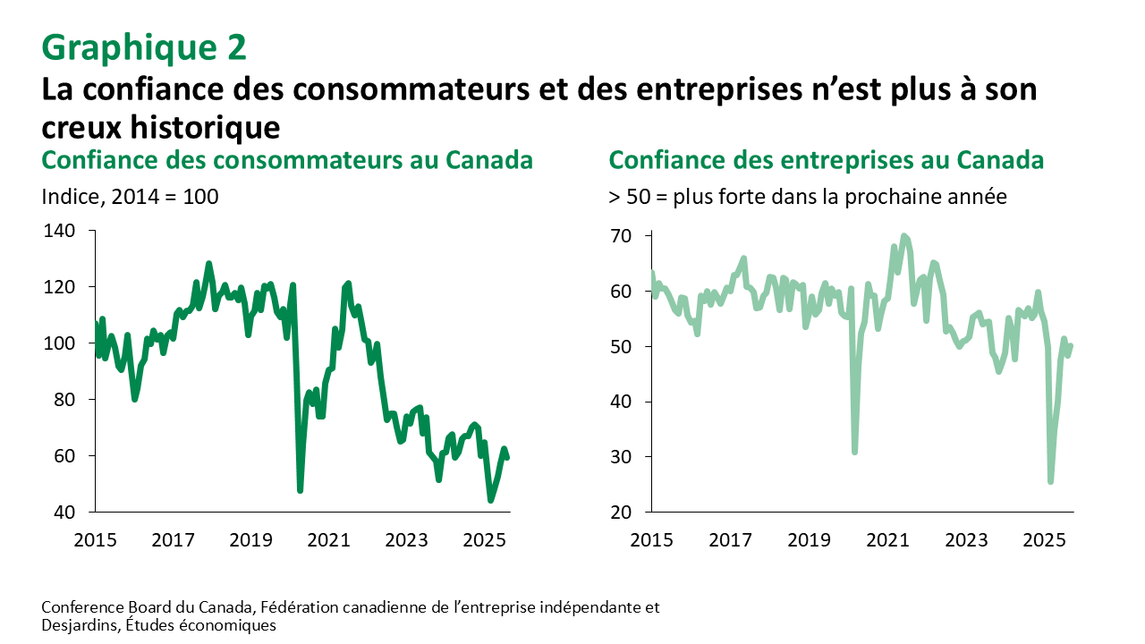 L’économie canadienne demeure cependant confrontée à des défis. Alors que certains secteurs semblent s’être raffermis, les données du marché de l’emploi Lien externe au site. ont été particulièrement faibles en juillet et en août. Les ventes au détail Lien externe au site. traduisent une certaine retenue dans les comportements d’achat des ménages en juillet, même si l’on tient compte de l’inflation. Toutefois, le résultat provisoire de Statistique Canada indique que les ventes au détail pourraient avoir augmenté en août. Néanmoins, la faiblesse récente de l’activité des ménages n’est pas une surprise, car une grande partie de la vigueur observée plus tôt cette année s’explique probablement par la volonté d’anticiper l’instauration de tarifs douaniers et de privilégier les achats locaux. En effet, le rythme soutenu de l’activité des ménages enregistré au printemps a contrasté avec le creux historique de la confiance des consommateurs au Canada, ce qui est une situation inhabituelle (graphique 2). Fondamentalement, les obstacles à la croissance de la consommation des ménages demeurent et s’étendent au‑delà de l’incertitude liée à la guerre commerciale, englobant des facteurs nationaux comme la hausse des paiements hypothécaires mensuels au moment du renouvellement, l’abordabilité encore limitée du logement, et le ralentissement rapide de la croissance de la population. Les investissements des entreprises devraient aussi être faibles au troisième trimestre, malgré un degré de confiance nettement supérieur par rapport au creux enregistré en mars. L’hésitation persistante à investir dans les machines et le matériel en raison de l’incertitude entourant la politique commerciale des États‑Unis, combinée au retrait d’un investissement ponctuel du secteur de l’énergie dans un projet pétrolier au large de Terre‑Neuve, devrait entraîner une baisse des investissements des entreprises au troisième trimestre, annulant ainsi la progression observée au deuxième trimestre.