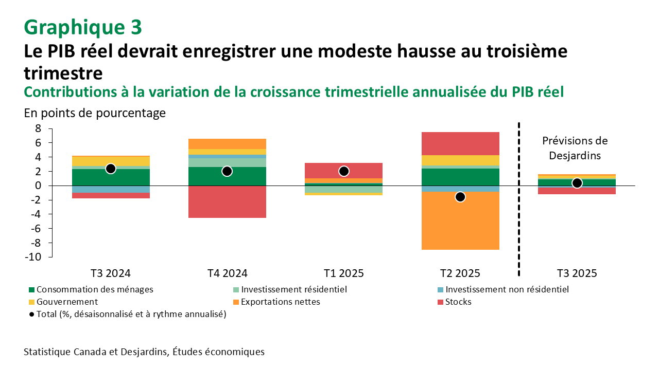 Alors, qu’en est‑il de nos perspectives de croissance économique au troisième trimestre? Nous prévoyons actuellement une croissance du PIB réel par industrie de 0,1 % en juillet, conformément au résultat provisoire publié par Statistique Canada. Compte tenu de cette croissance, des données plus générales recueillies jusqu’à maintenant au troisième trimestre et de l’élimination des droits de douane sur la plupart des biens de consommation importés des États‑Unis depuis le 1ᵉʳ septembre, nous prévoyons actuellement une croissance annualisée de 0,0 % à 0,5 % du PIB réel au troisième trimestre (graphique 3). Bien que notre prévision soit inférieure à la prévision de base de la BdC pour le troisième trimestre, qui mise sur une croissance de 1,0 % selon son Rapport sur la politique monétaire de juillet 2025 Lien externe au site., nous prévoyons que le PIB réel à la fin de 2025 sera plus ou moins conforme aux perspectives de l’été de la BdC. Même s’il ne s’agit pas d’un rebond spectaculaire de l’économie, on peut tout de même croire qu’une récession en 2025 au Canada n’est pas une certitude.