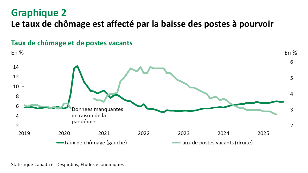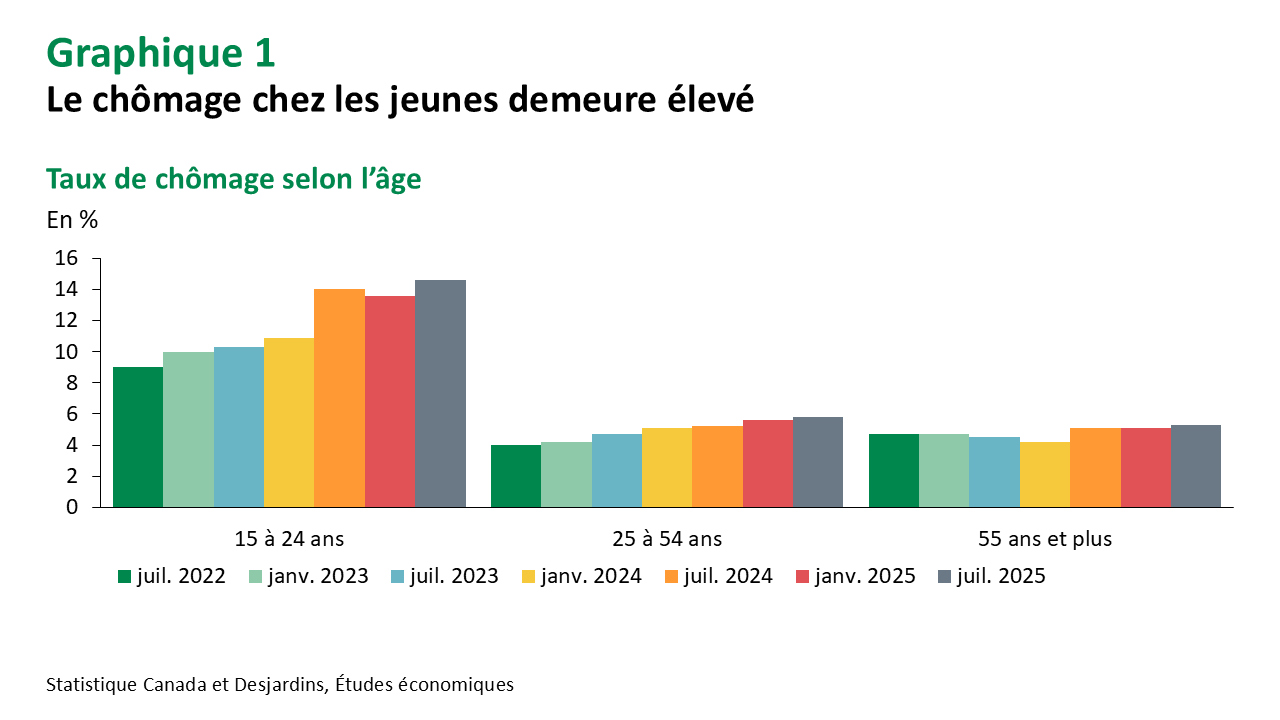 Le taux de chômage est demeuré stable chez les personnes en âge de travailler (25 à 54 ans), à près de 6 % en juillet. Malgré la saison estivale propice à l’emploi, les pertes d’emplois ont été fortement concentrées chez les jeunes (15 à 24 ans), avec une baisse de 34 000 emplois, tandis que leur taux de chômage a atteint près de 15 % (graphique 1).